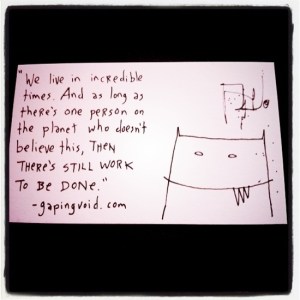 Meet Hugh MacLeod. He is well known in the digital world with 36,000 followers on Twitter. I wanted you to meet him because much of what he says applies to people of all ages. Hugh is a cartoonist, a blogger and author. Most of all he is a realist. He talks about things most of us are afraid to surface or even seriously think about.  His company, gapingvoid, is a weblog where his illustrations spread messages, inspire people, help businesses kick butt and support causes. He was blogging long before anyone actually knew what a blog was.The reason why Hugh is often referred to as a digital guru is because he used the Internet to achieve creative freedom.