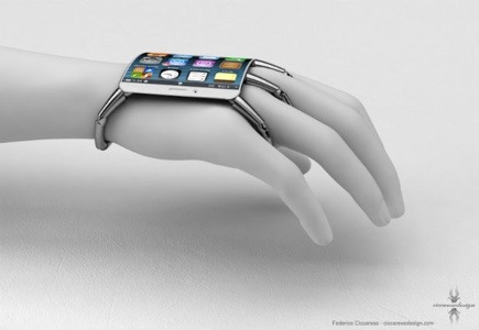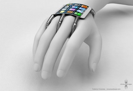 The famous tech blog site, Mashable, gives us a glimpse into “possible” future iPhone (and other smartphones) designs. Instead of a touchscreen slab that’s held in the palm of your hand, imagine the “iPhone 5 with a new curved design that’s actually worn on the back of your hand.