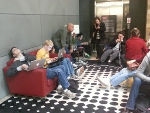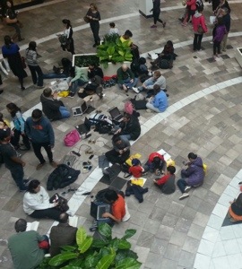 Today, everyone finds a way to charge and connect. A downtown Starbucks was closed, but their wifi was still being accessed by hundreds who sat just outside the front door.