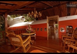 This is a commercial jet-turned-two bedroom apartment situated on a 59-foot pedestal in Costa Rica. It is finished in teak paneling and has an adjoining terrace facing the ocean.
