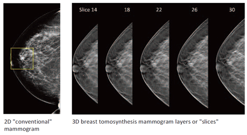 Another explanation is that it takes multiple images of the breast from different angles. These images can be viewed separately or put together as a 3D reconstruction of the breast tissue. Sources say the 3D machines have a 40 per cent improvement rate in breast cancer detection.