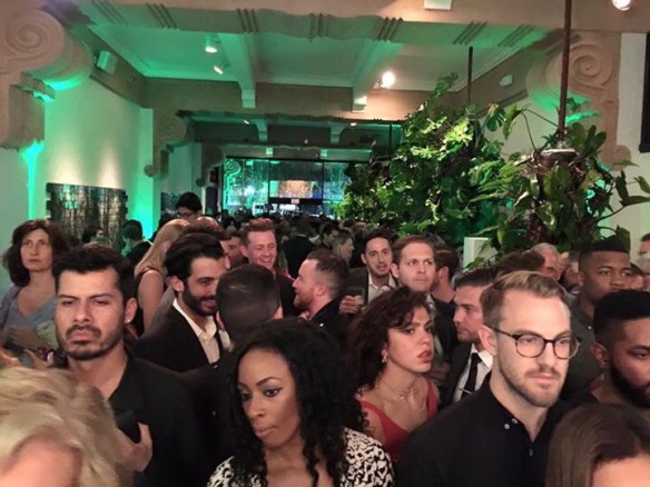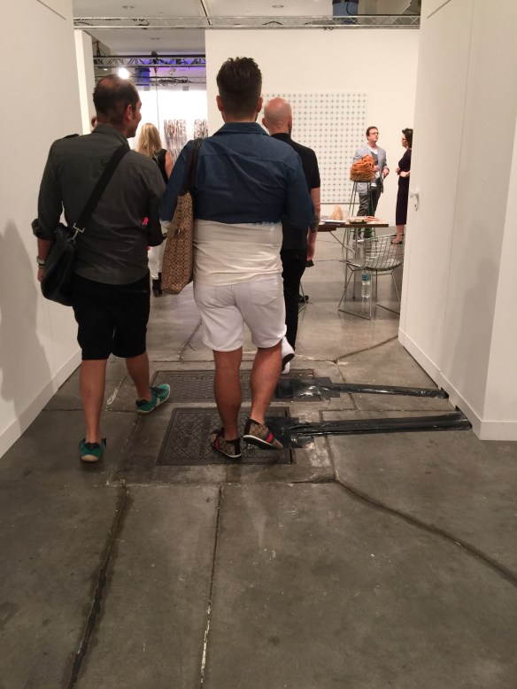 Art Basel crowd. lined up outside behind velvet ropes to get in.