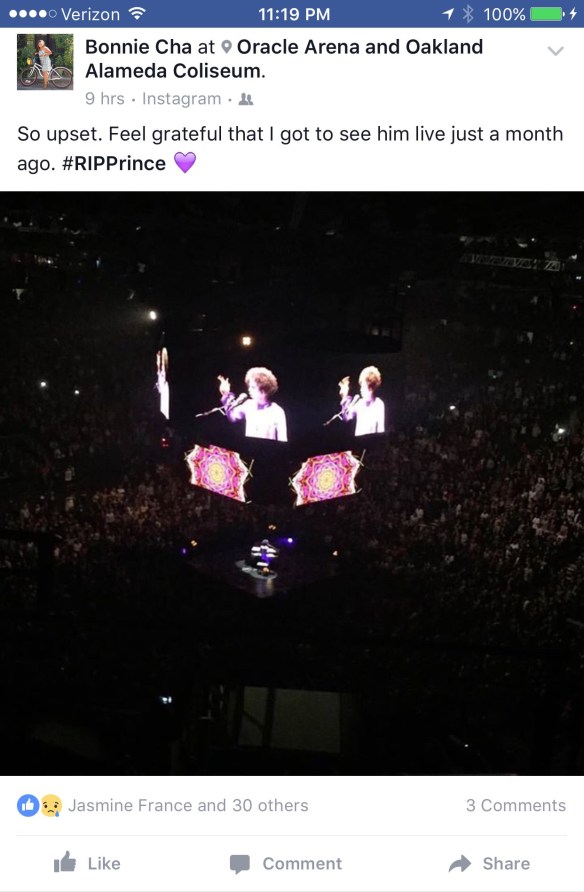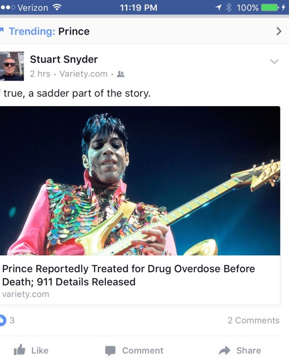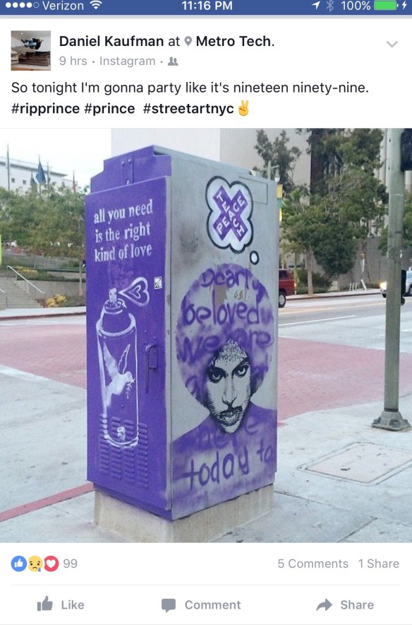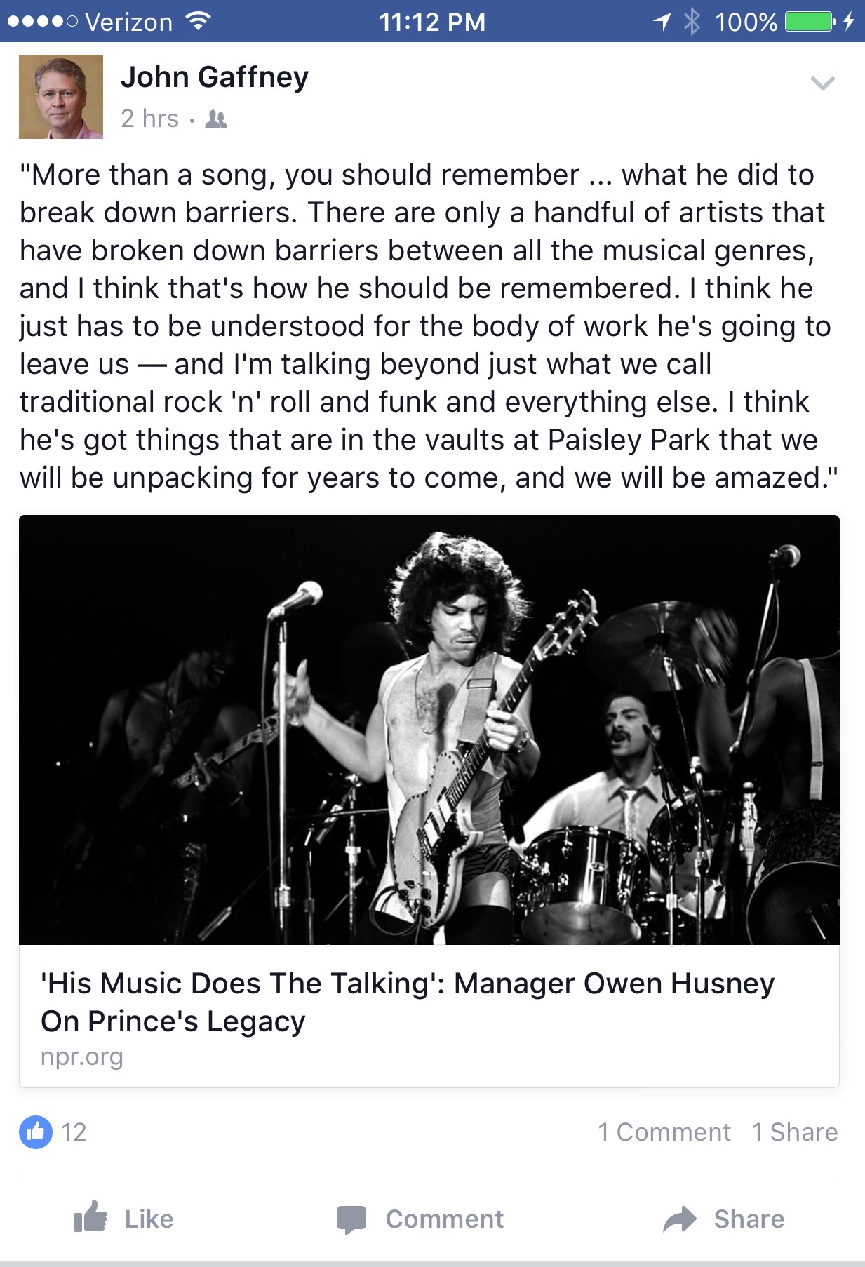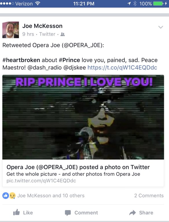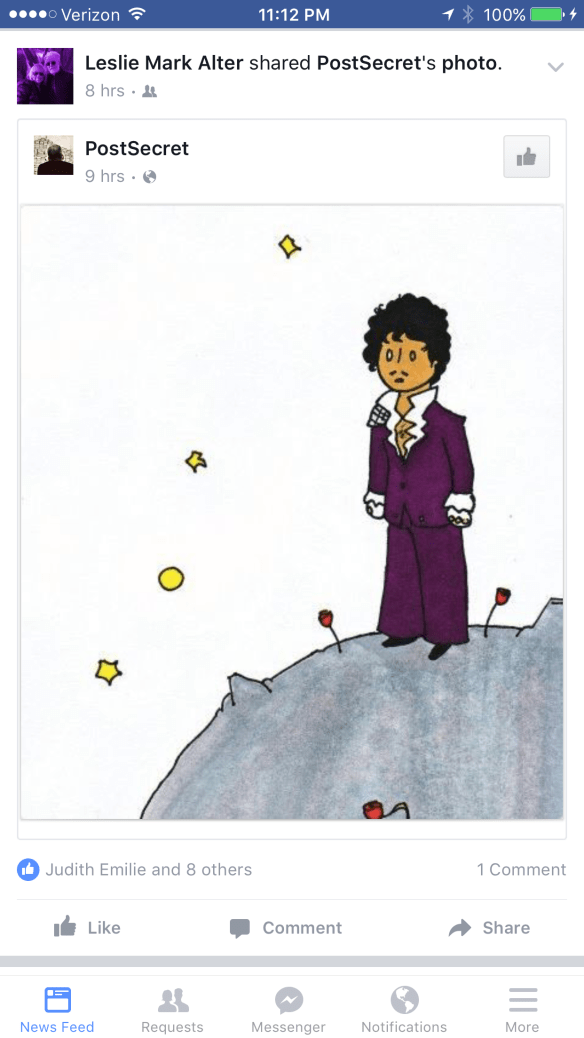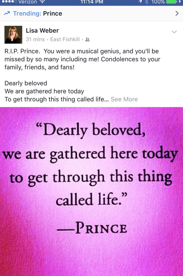 Facebook Tributes To Prince Posted on April 21, 2016 by loiswhitmanhess My news feed had at least 50 posts about the death of Prince. I wanted to share a few with you. #RIP Prince Share this post! Click to share on X (Opens in new window) X Click to share on Facebook (Opens in new window) Facebook Click to share on LinkedIn (Opens in new window) LinkedIn Click to share on Tumblr (Opens in new window) Tumblr Click to share on Pinterest (Opens in new window) Pinterest Click to email a link to a friend (Opens in new window) Email Like Loading...