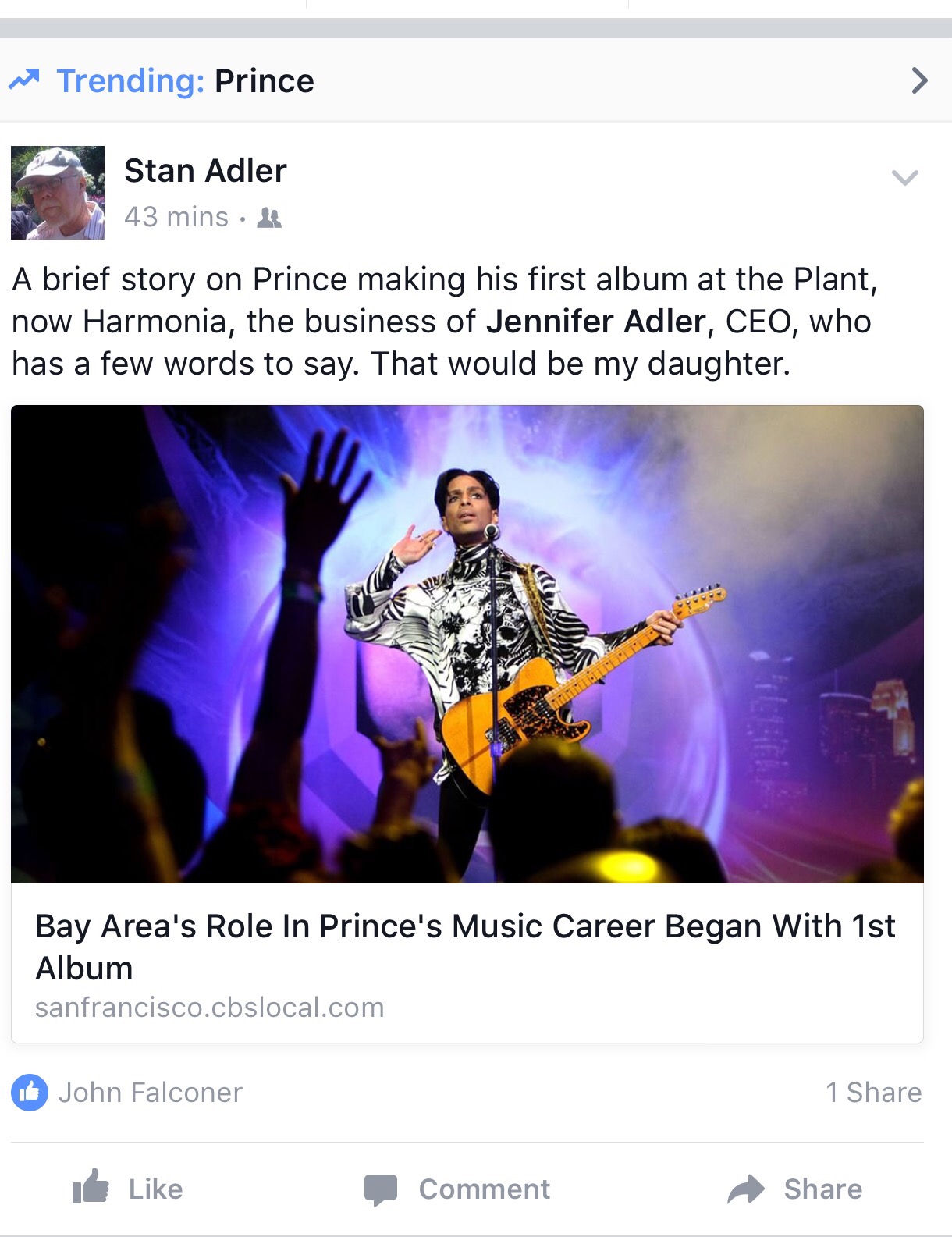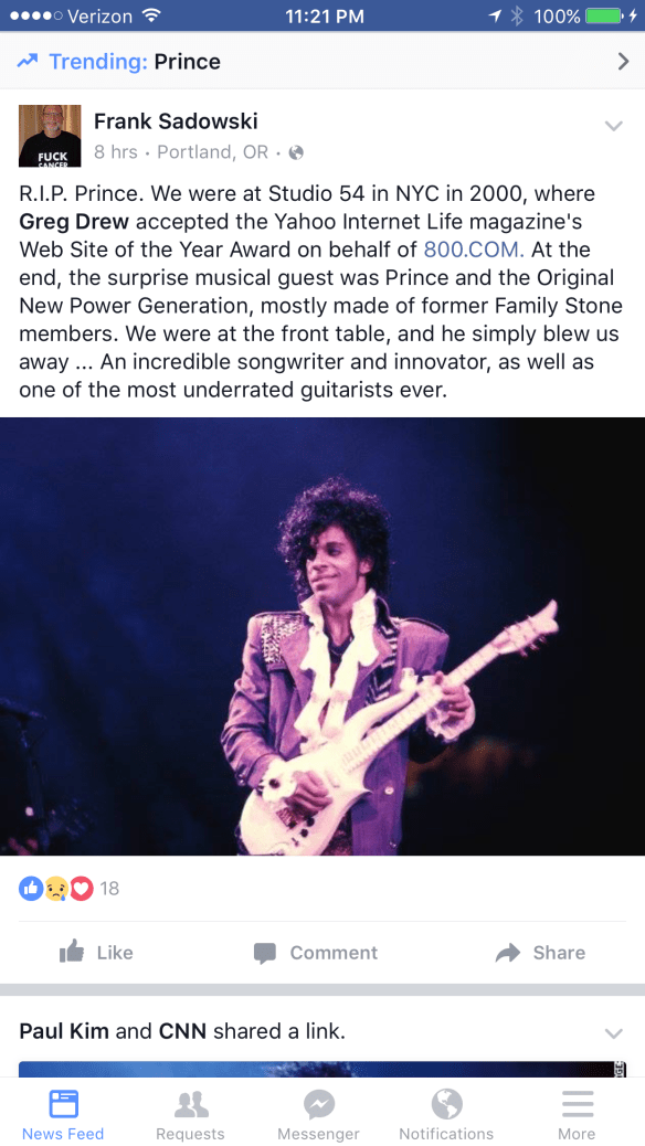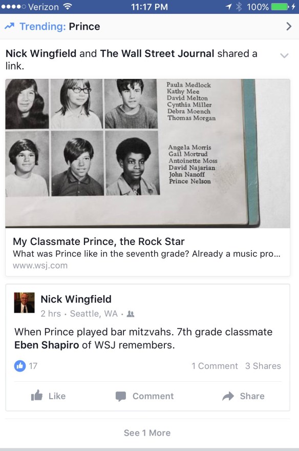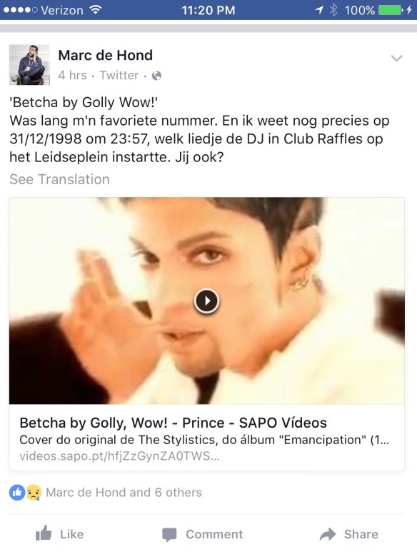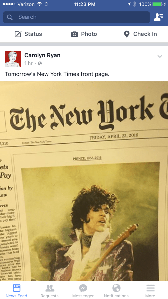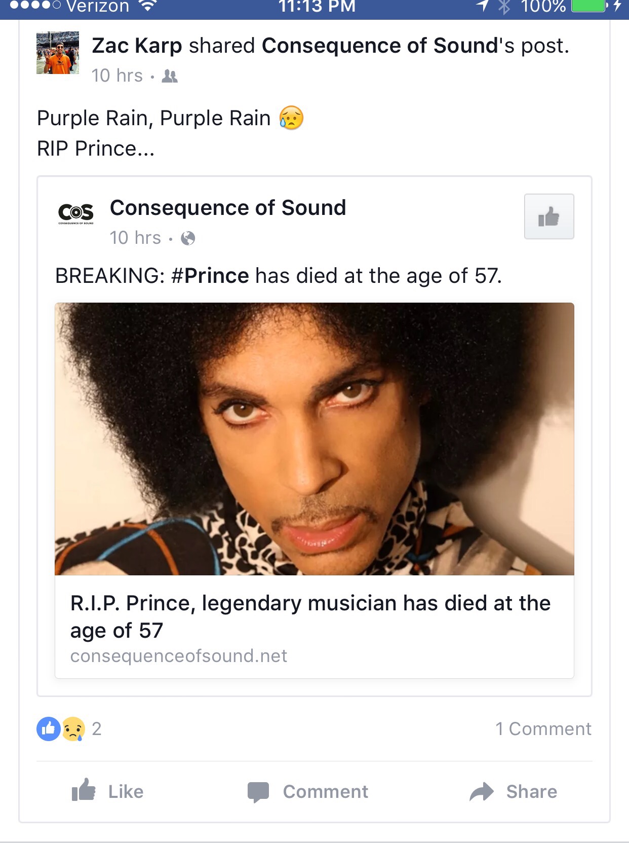 Facebook Tributes To Prince Posted on April 21, 2016 by loiswhitmanhess My news feed had at least 50 posts about the death of Prince. I wanted to share a few with you. #RIP Prince Share this post! Click to share on X (Opens in new window) X Click to share on Facebook (Opens in new window) Facebook Click to share on LinkedIn (Opens in new window) LinkedIn Click to share on Tumblr (Opens in new window) Tumblr Click to share on Pinterest (Opens in new window) Pinterest Click to email a link to a friend (Opens in new window) Email Like Loading...