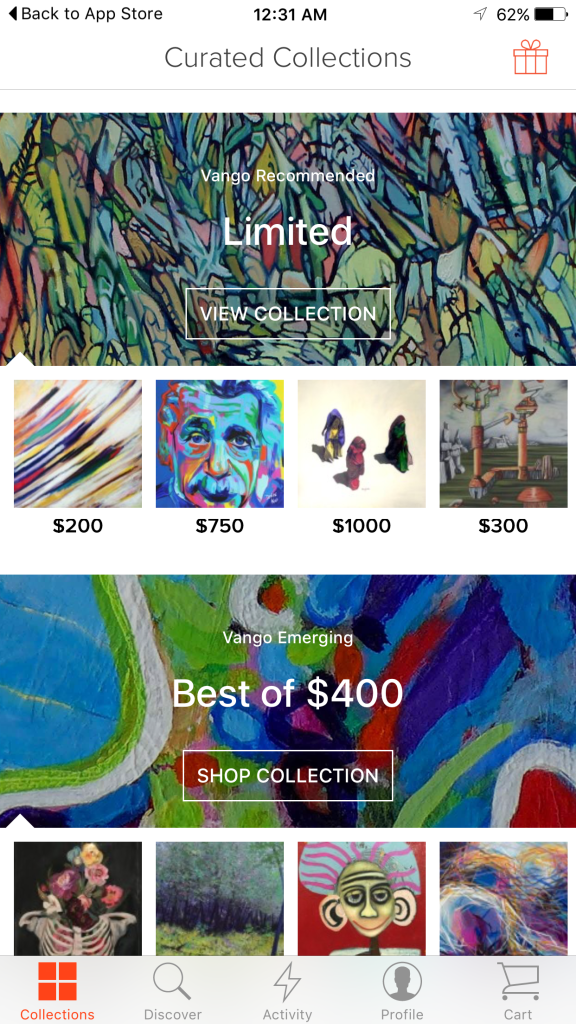 Vango has lots of opportunities for art collectors. You can choose trending, local, or recently posted art. You can zoom in and/or use the “Preview on Wall” which lets you see the art work on your wall at home. This Vango feature is super fun.
