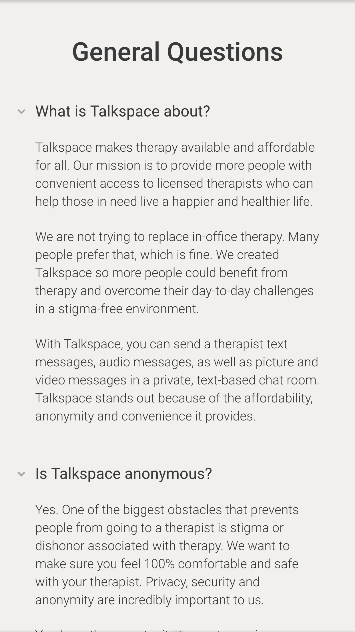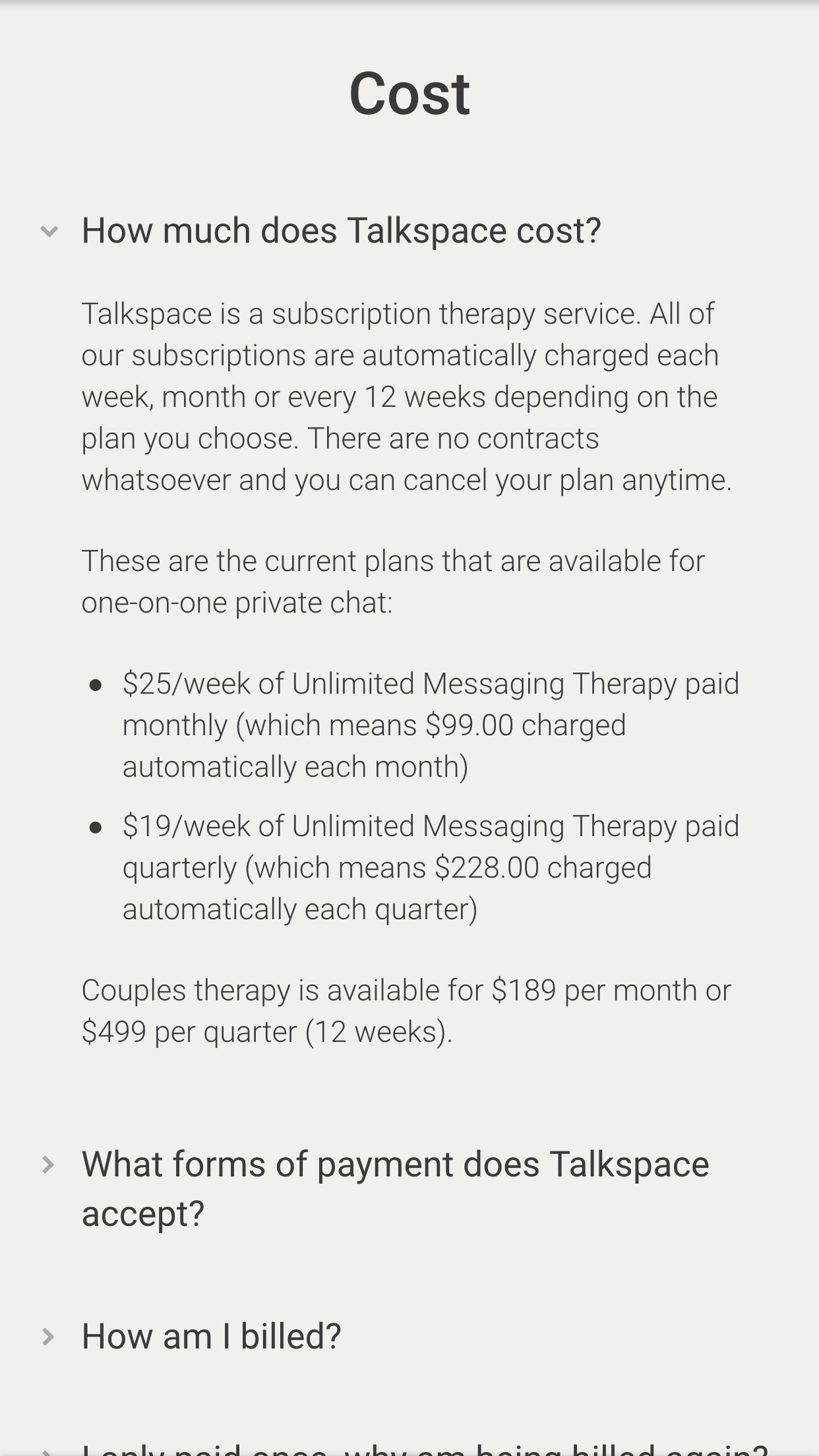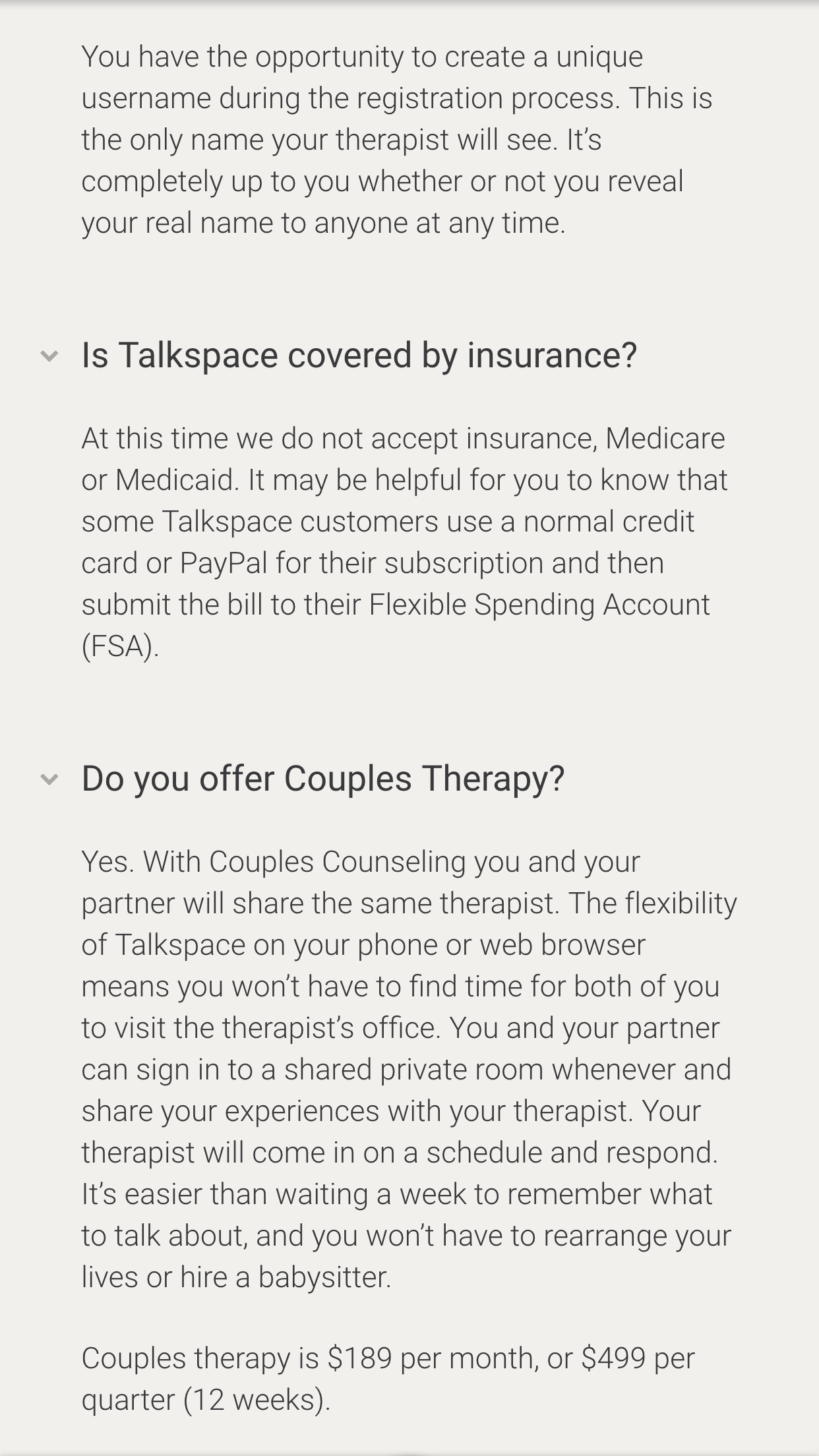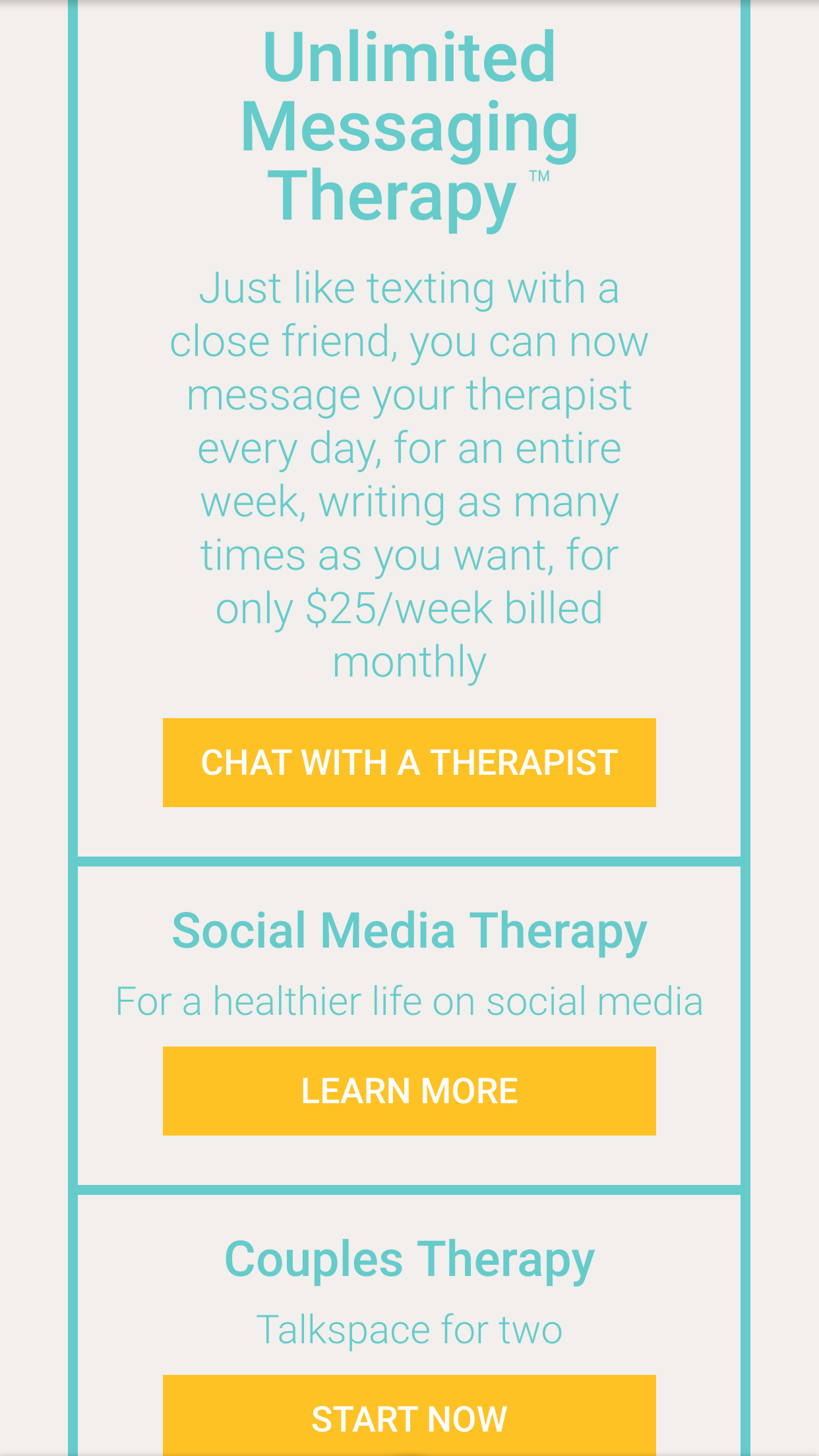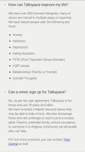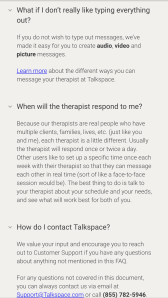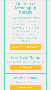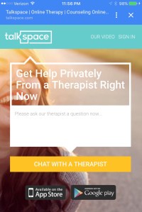 The world of apps is taking advantage of this trend too. I decided to cut and paste the “TalkSpace Online Counseling” app so you can see how it works. It’s all very civilized.