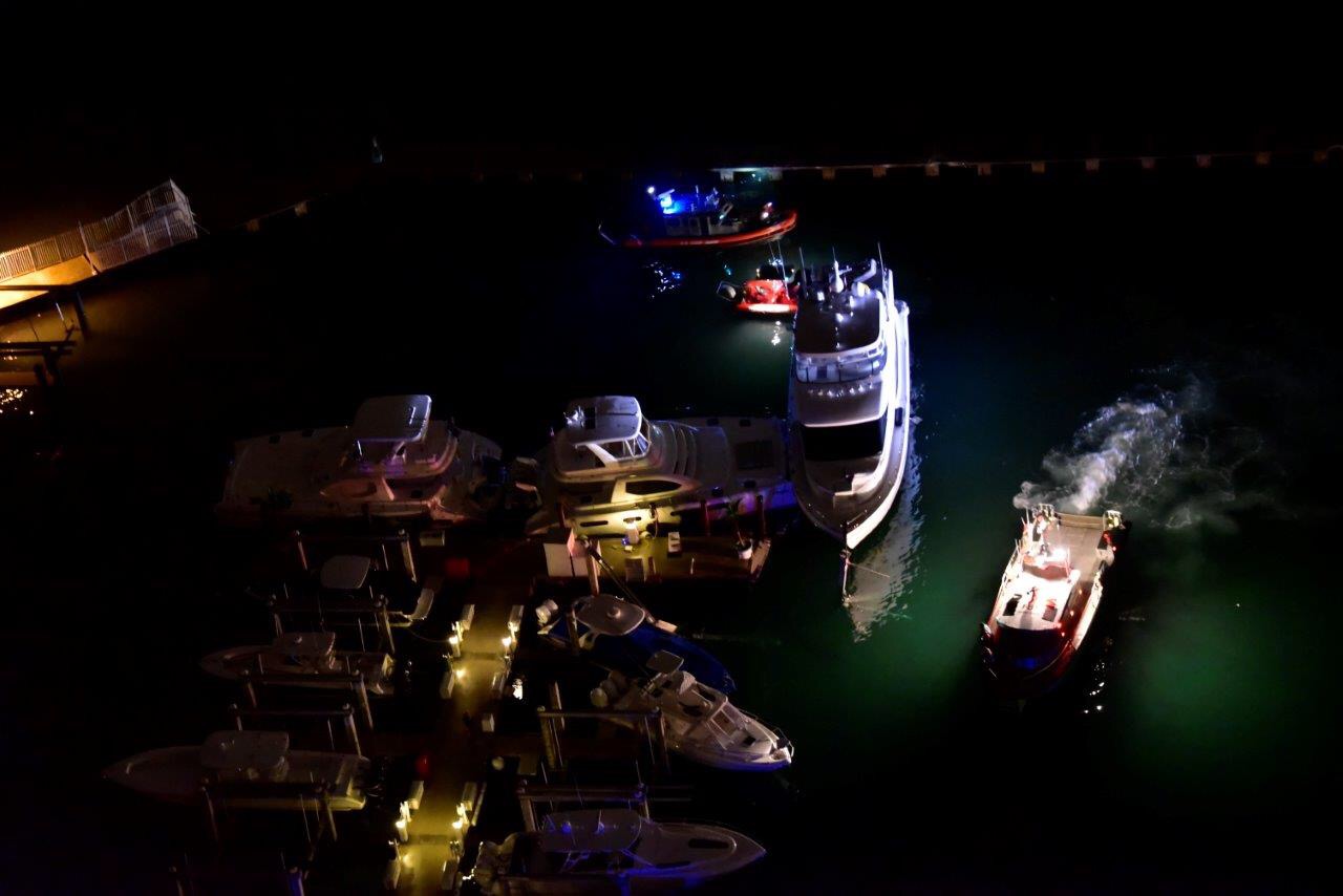 It was 11:45pm Sunday night when Eliot and I heard strange noises outside our windows. An out-of-control yacht was smashing into other boats in the Miami/South Beach Marina, 36 stories below our window. I heard people yelling “Help,” “Help.” I called police and Eliot shot the first photos. Five minutes later police, helicopters, coast guard, fire engines,and ambulances showed up. This happened just down the waterway from where Jose Fernandes died last week. A helicopter has a search light on entire area. Scuba divers are looking for something. Very scary to watch a sizable yacht, out-of-control, and bashing into others at least six times. More when I find out what actually happened.
