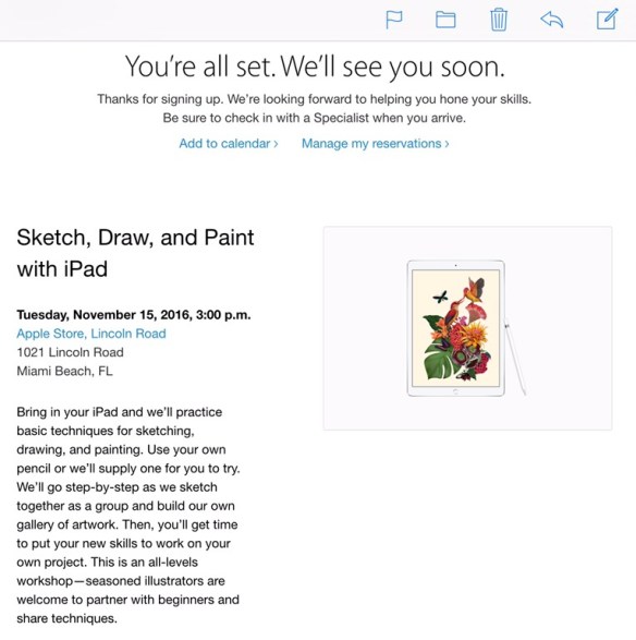 I took a giant step forward today in my wonderful world of coloring. I actually went over to the Apple Store on Lincoln Road, Miami Beach, and took a class on Sketch, Draw, and Paint With the iPad.