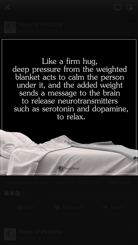 I saw these posters on social media several times this week and wanted to share them with you because many seniors have trouble sleeping. Over the years, several friends told me they got a better night’s sleep if they felt like they had a security blanket on them. Check with your doctor. It works for me.