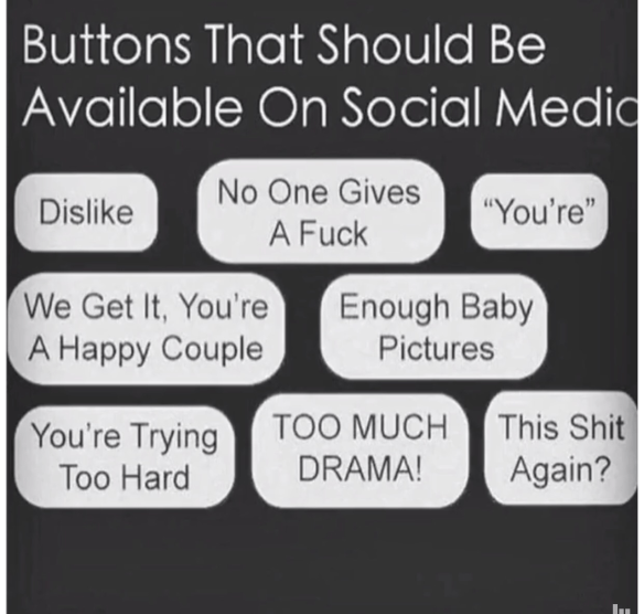 Loved the social media ‘buttons’ best—especially “no one gives a ….” That button would surely be popular!