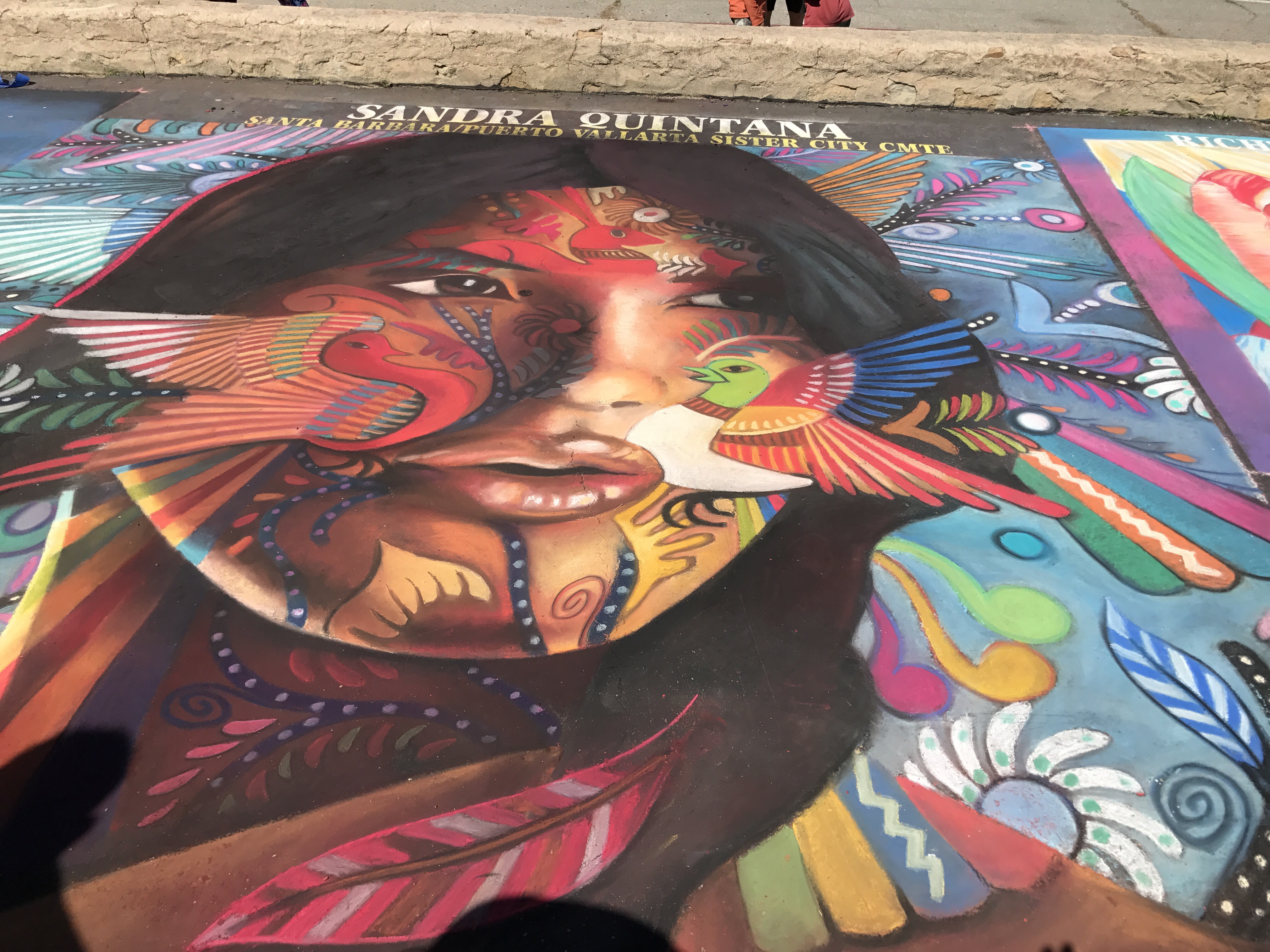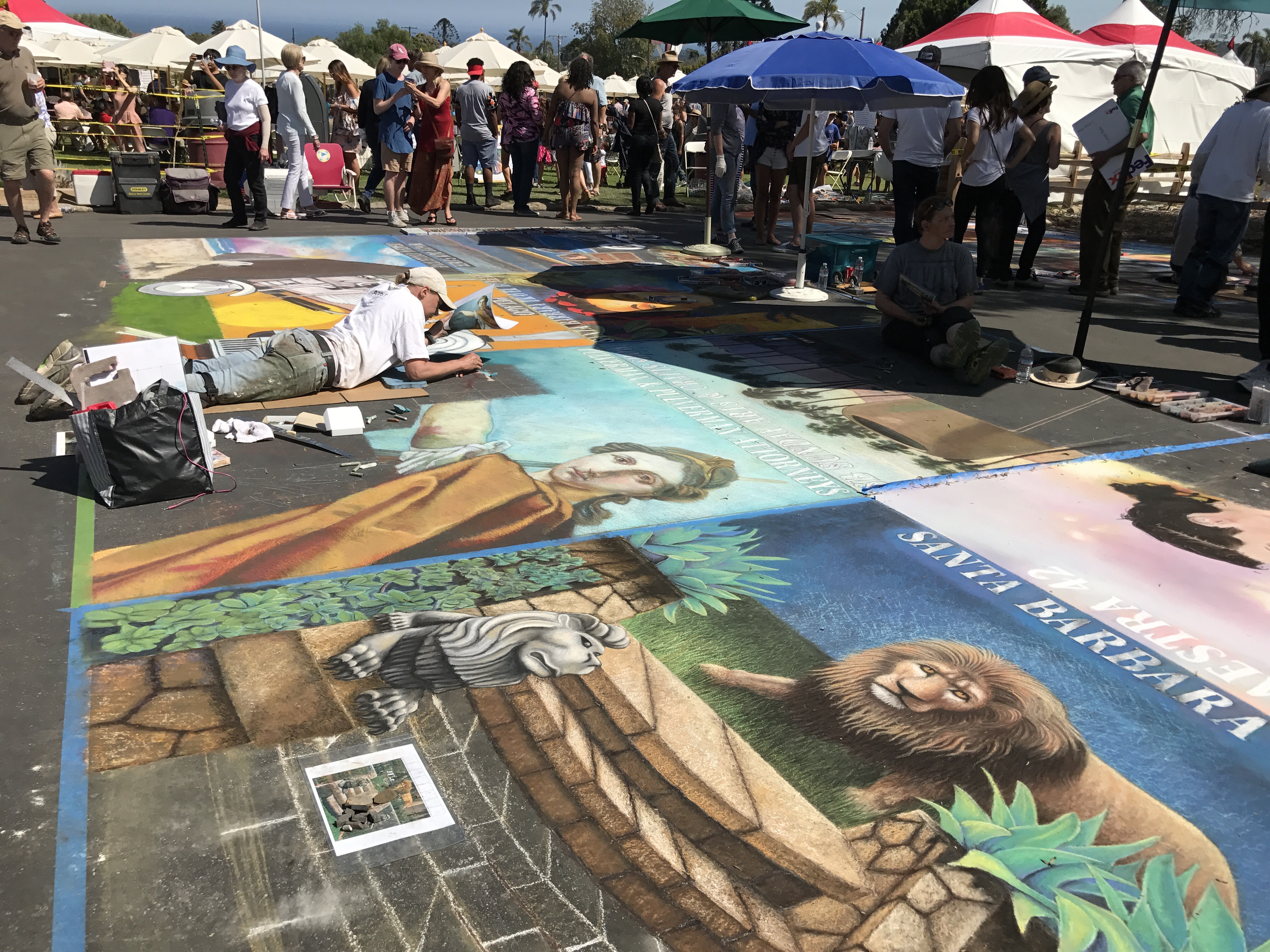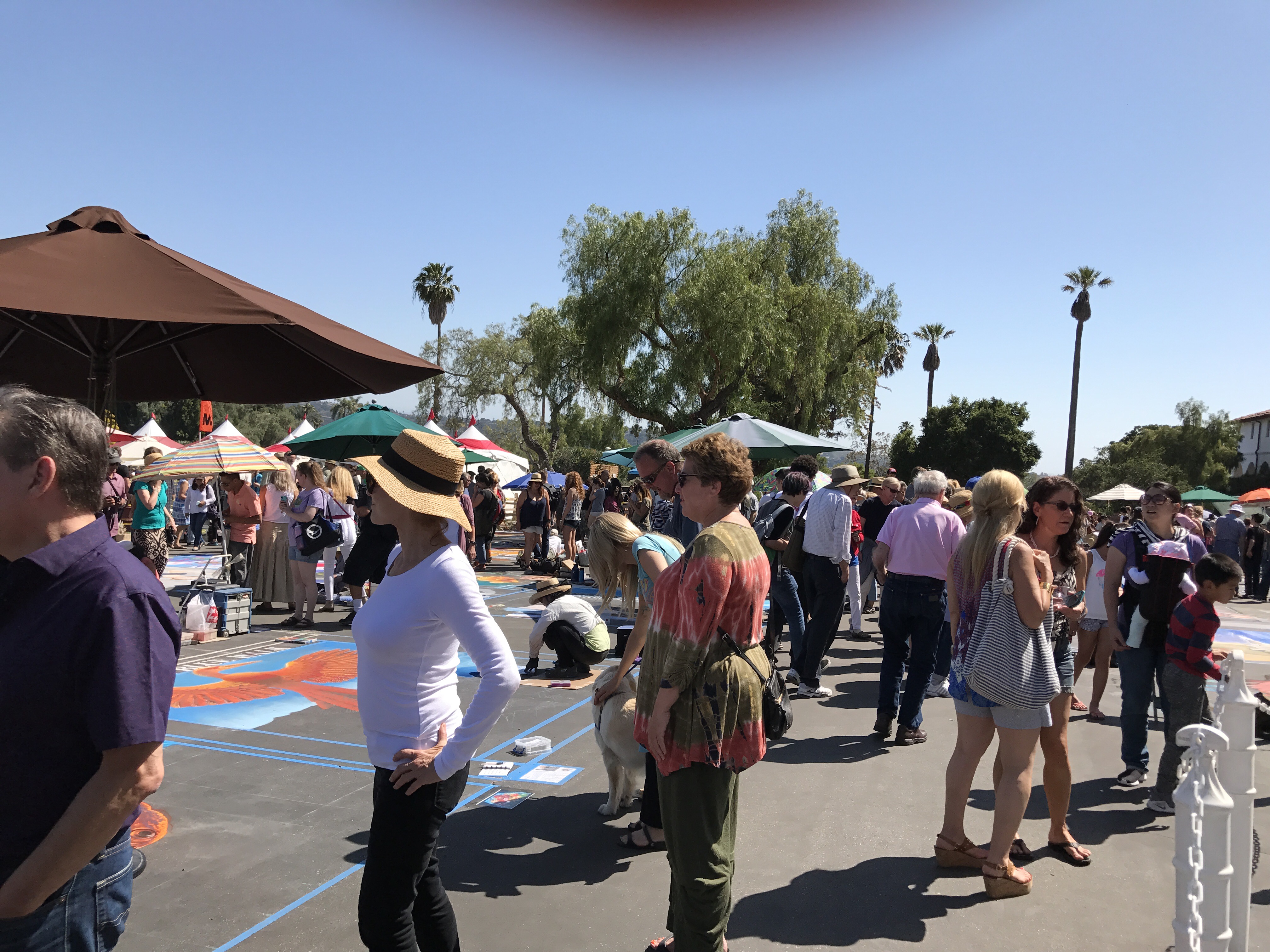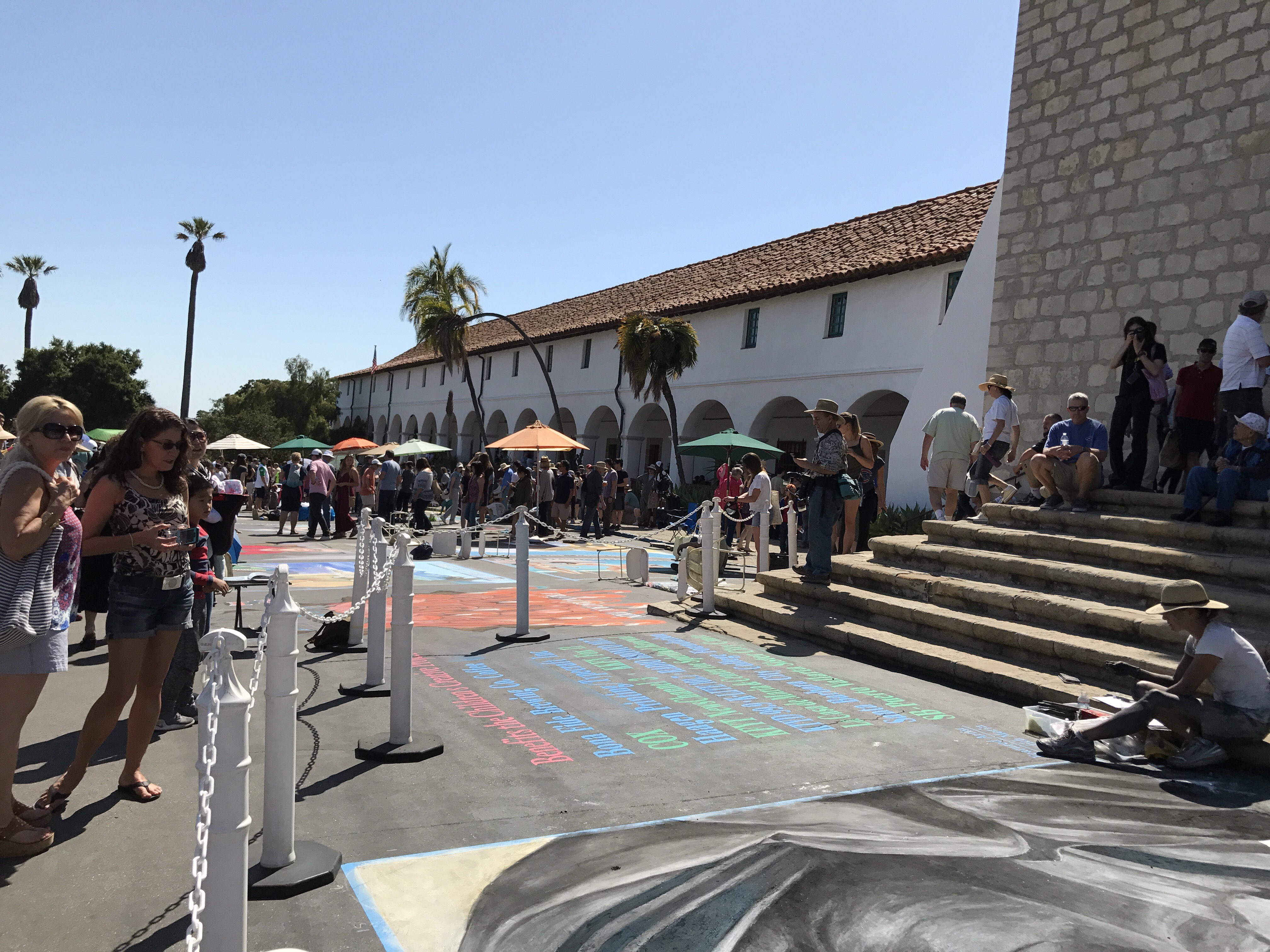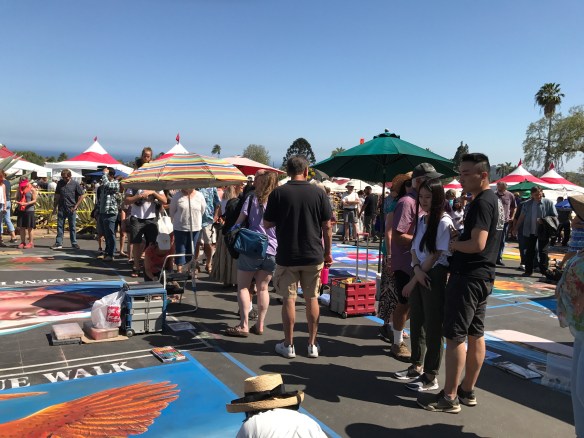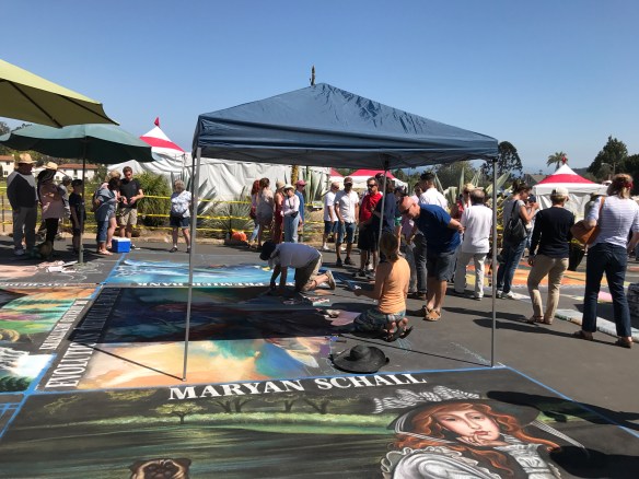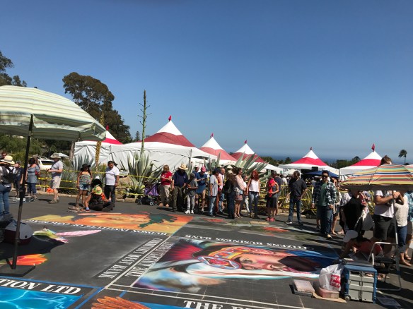 It’s so wonderful witnessing people helping people, especially people helping children. Today our friends, Andrea and Ron, took Eliot and I to see the generosity of many talented artists who transformed the pavement in front of the Santa Barbara Mission into works of art. This project raised funds for the Children’s Creative Project (CCP), a nonprofit arts education program of the Santa Barbara County Education Office. Each artist, sponsored by a local business, used pastel colored chalk to paint stunning square drawings.