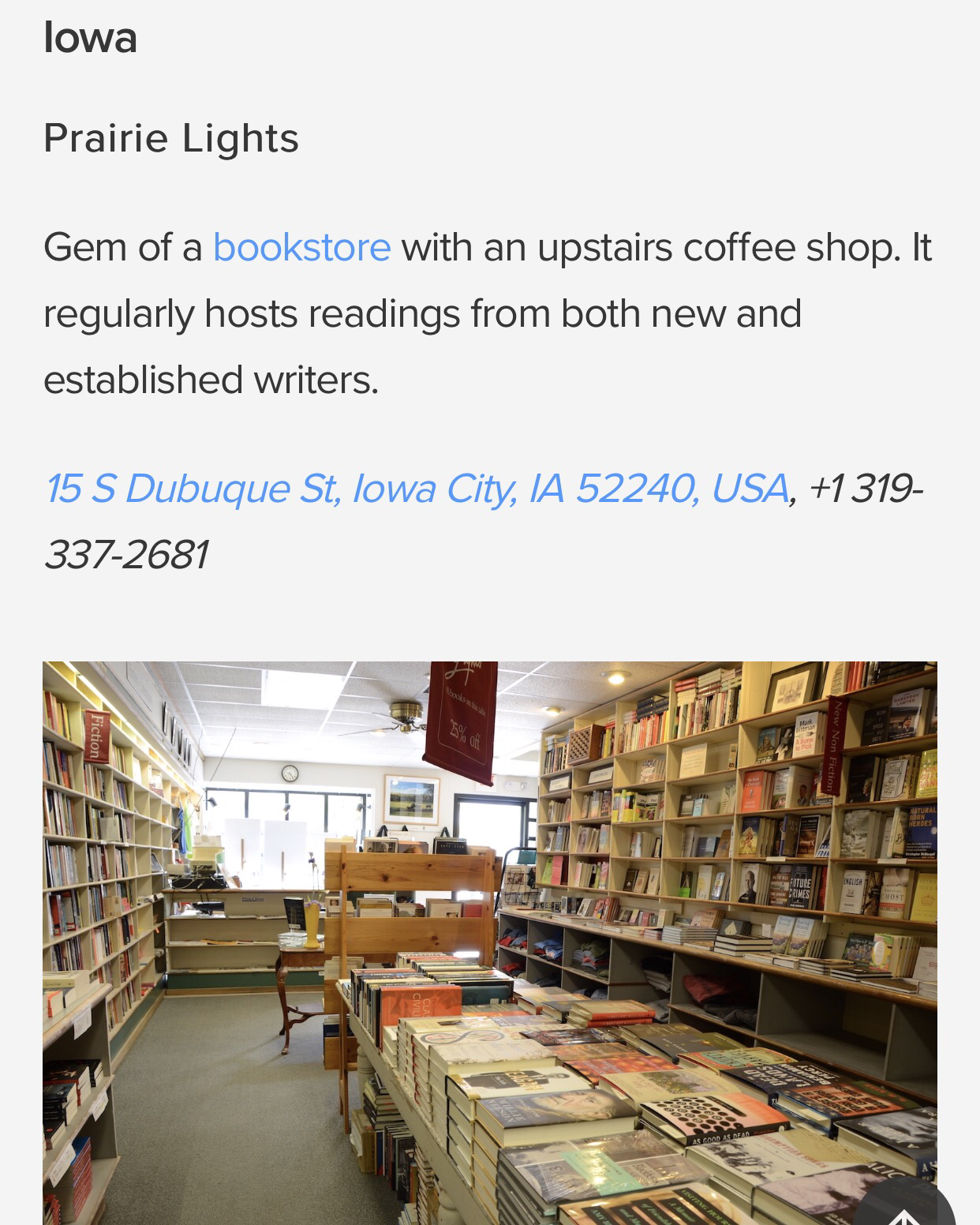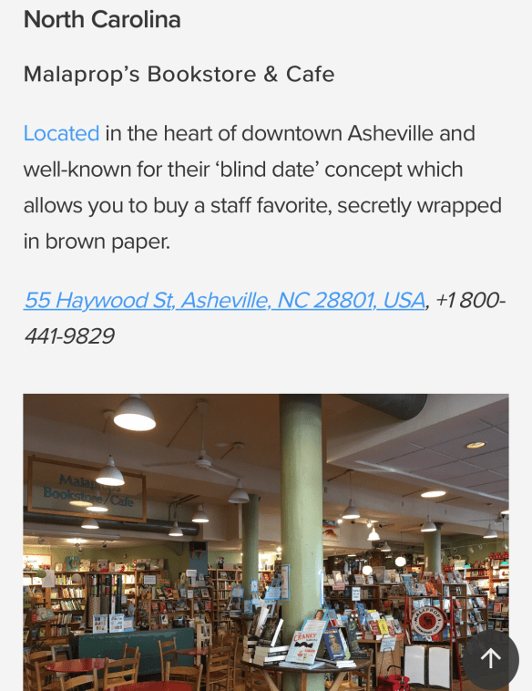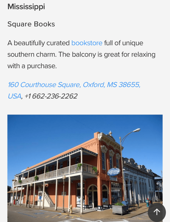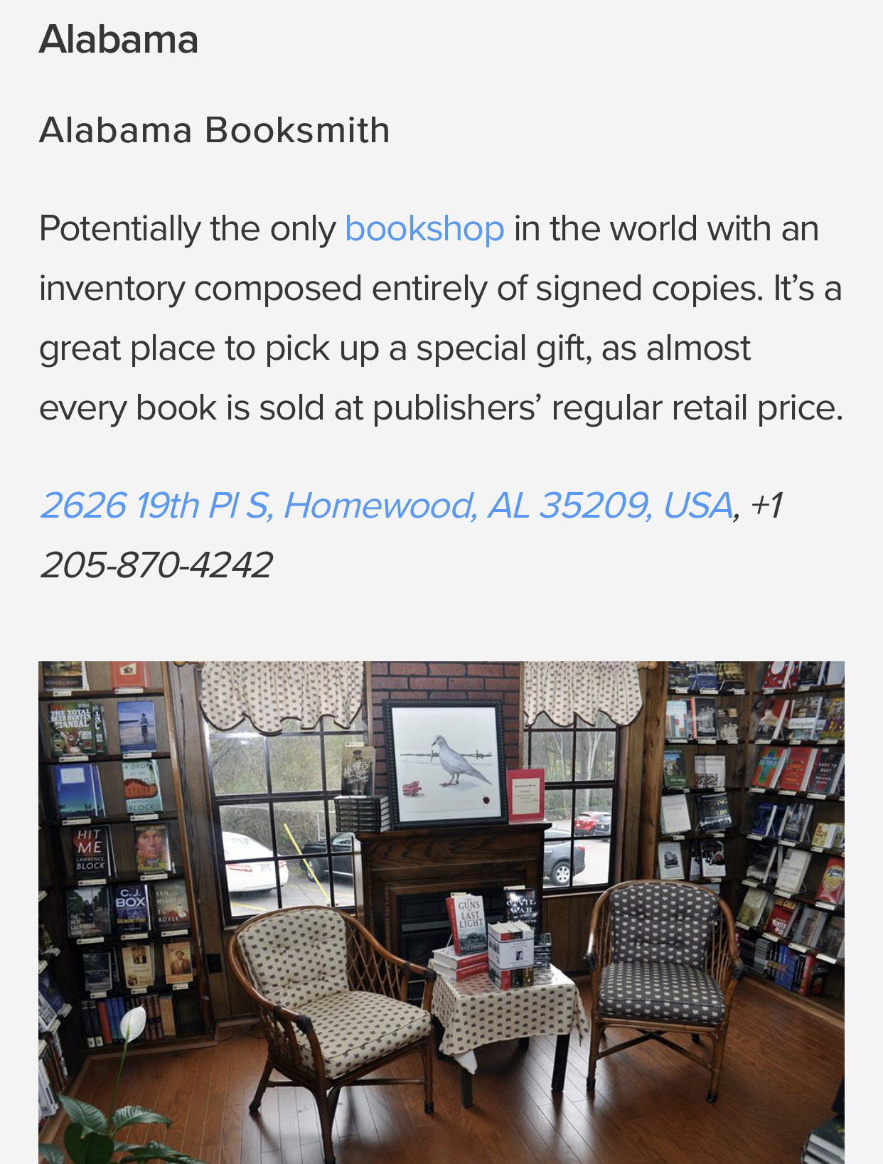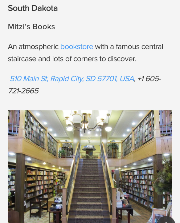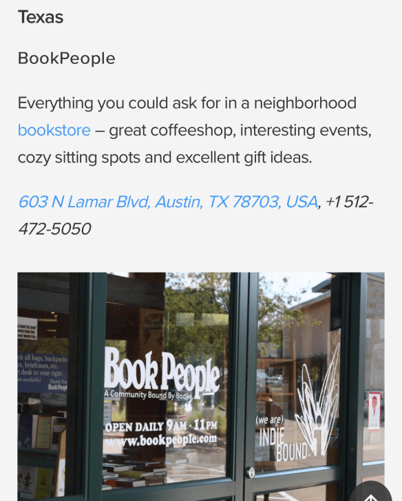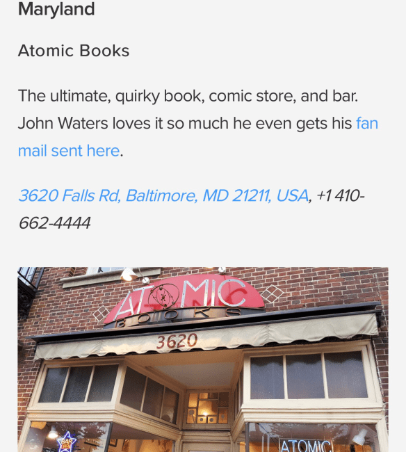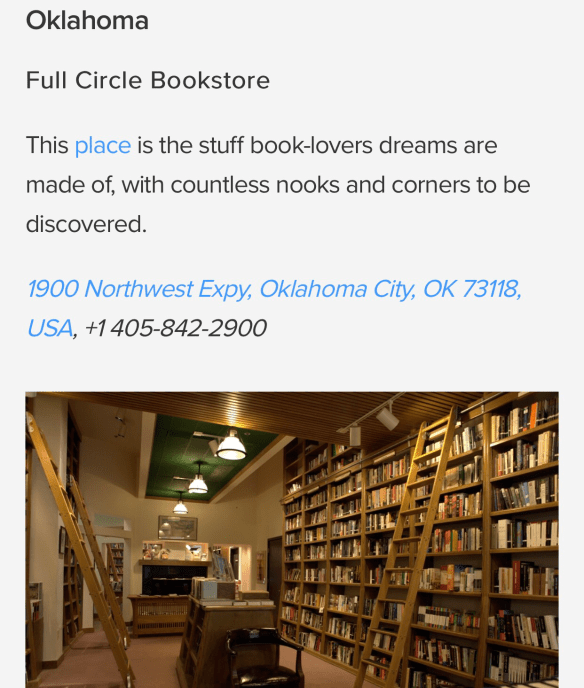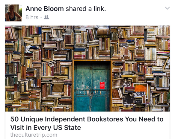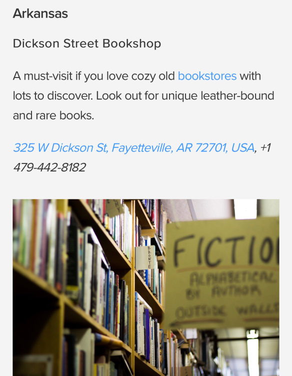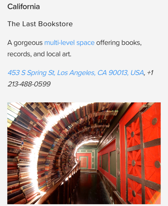 This is a collector’s item. Save it. We all know that bookstores are a thing of the past. The Culture Trip, an app, just did a wrap up of 50 unique independent bookstores that are still around the country. My lovely friend, Anne Bloom, just posted the bookstores and locations on Facebook.
