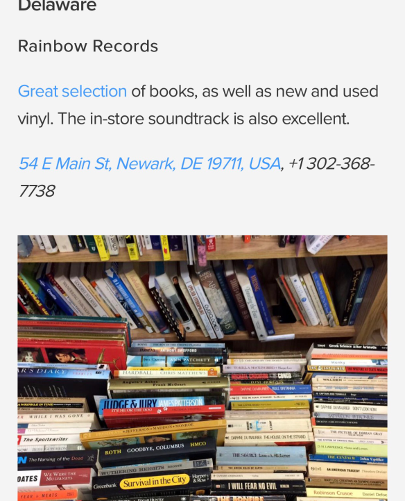 So what did I do? I quickly copied her post to deliver you a keepsake. I’m definitely filing this post in a safe spot because I love visiting bookstores. I want to know which city has what. I used to spend hours every weekend roaming through book and record stores. It was my social life. It was cheap, informative and fun.