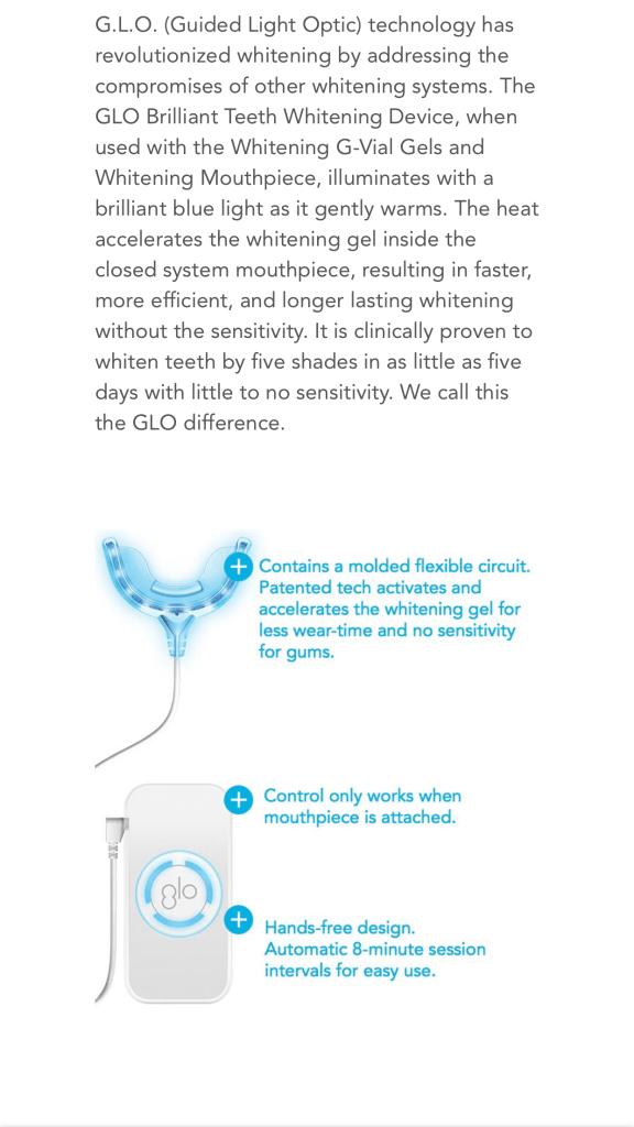 The Glo Science teeth whitening product has been around since 2010, but I’m not sure if many DigiDame readers know about it. I’m in the middle of using it now. I feel it’s a much easier process than the mechanism with the trays.