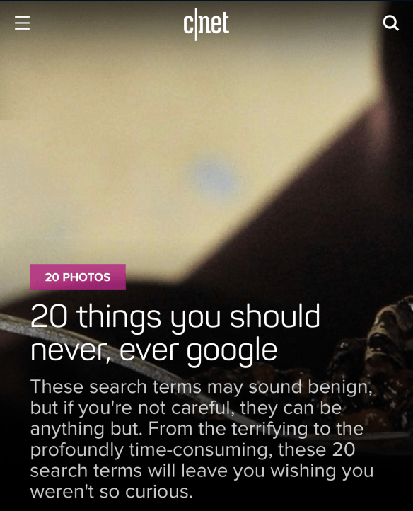 I’m sure you are in the same situation. CNET did a story about 20 things you should never Google because they are either scary, or are marked as “trouble spots.” If you land on the wrong website, the police could storm your home.