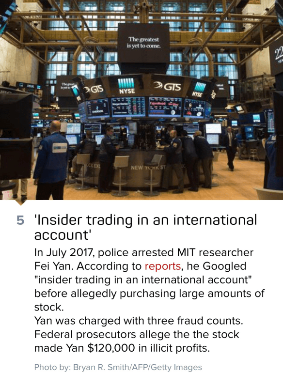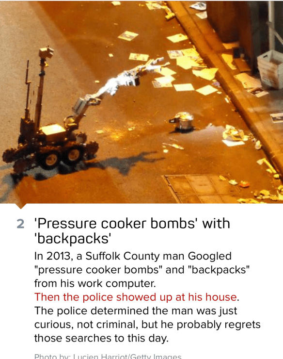 It’s unlikely that the police would be entering my home anytime soon, looking for someone who wanted to build a bomb, or do insider trading! But I understand that it is wise not to key in words which may be considered subversive or dangerous. I couldn’t open the CNET story, and am actually relieved!