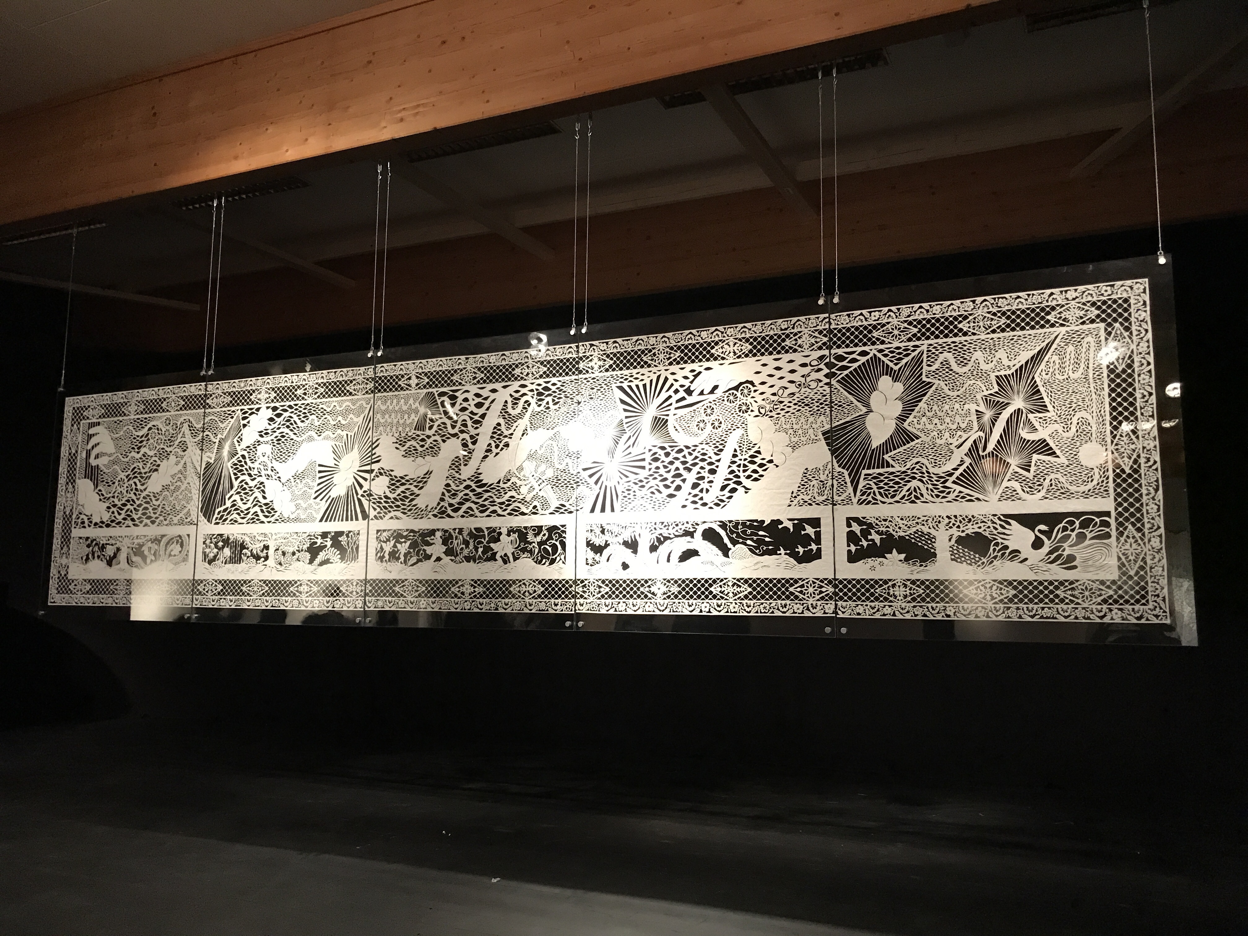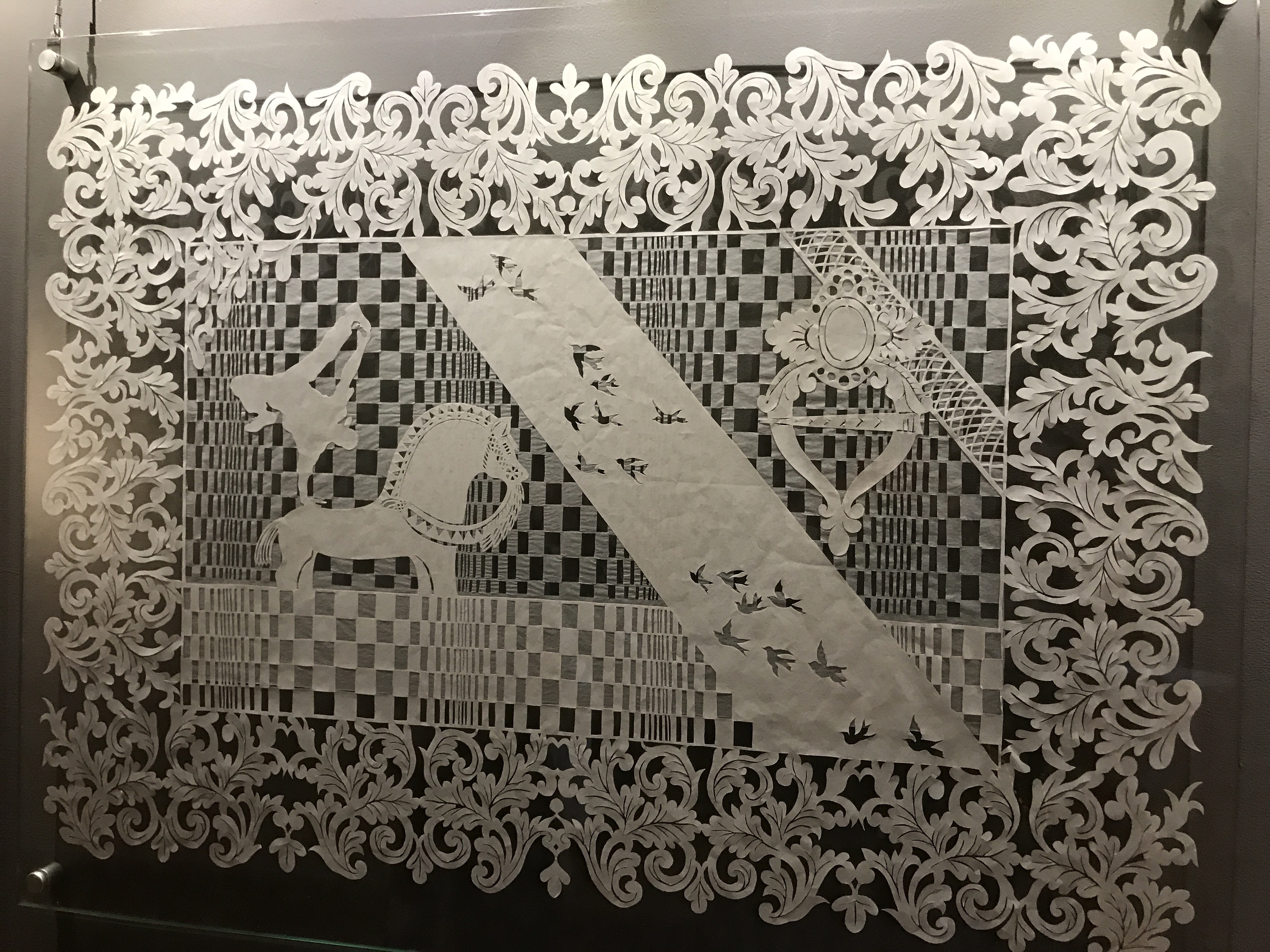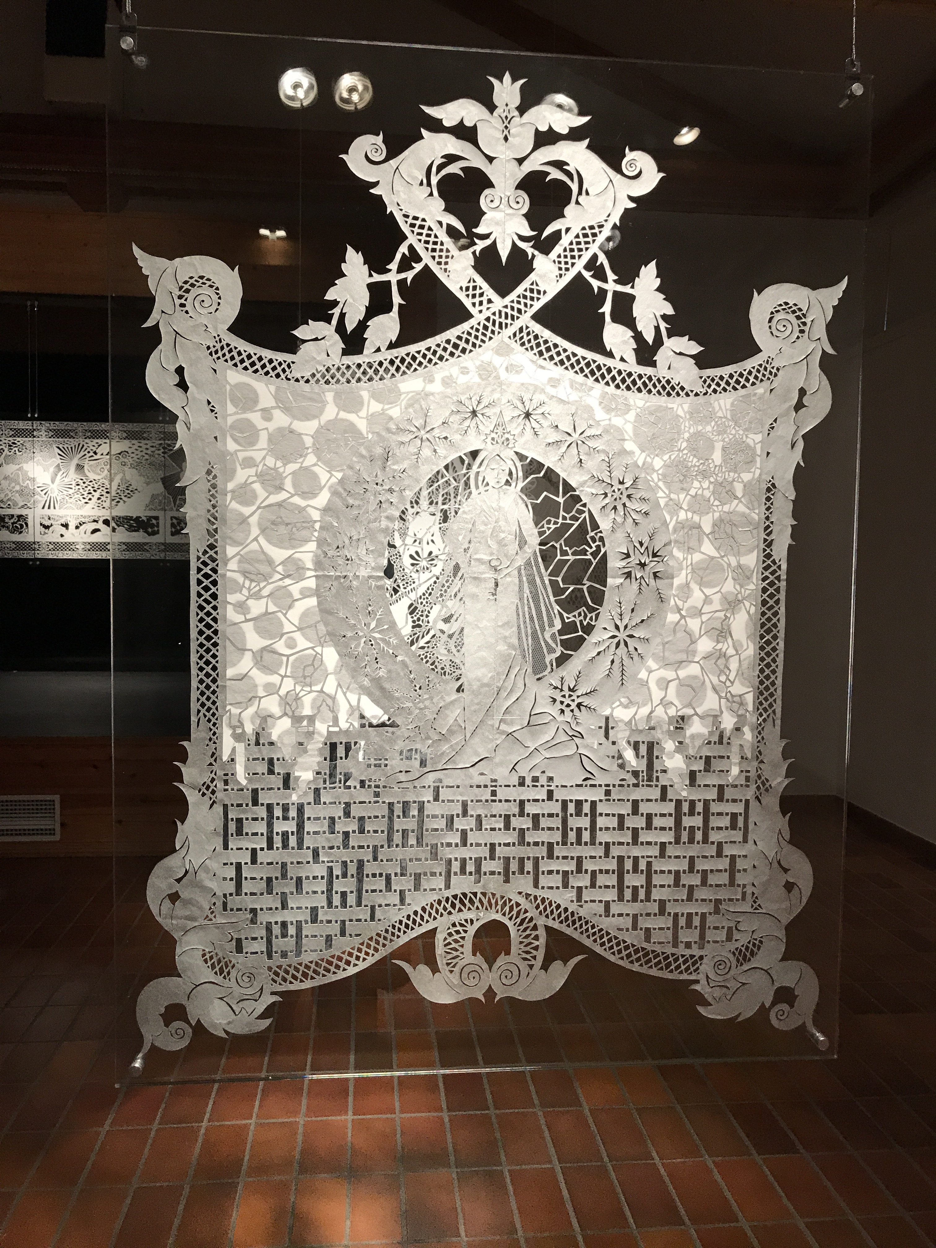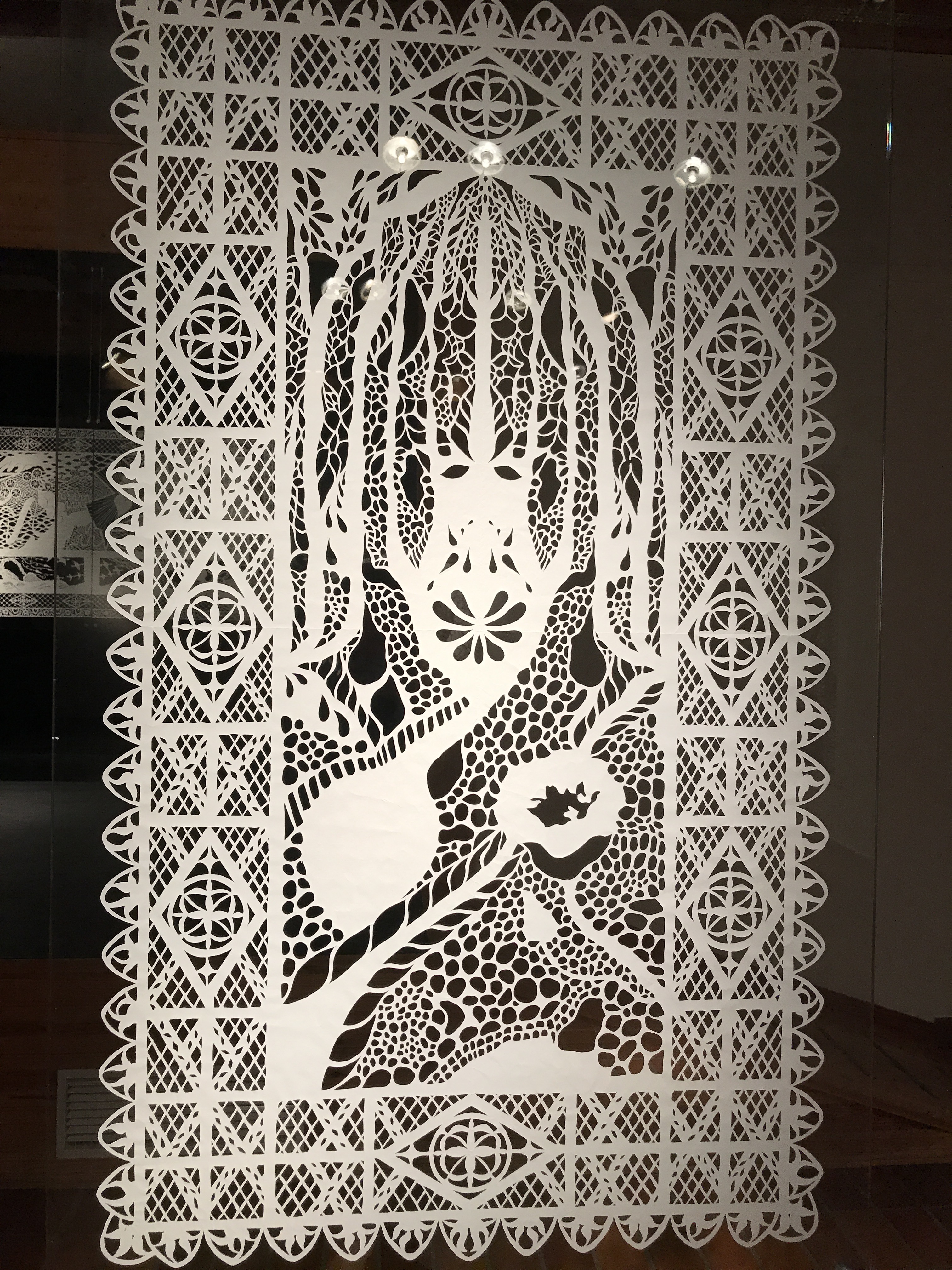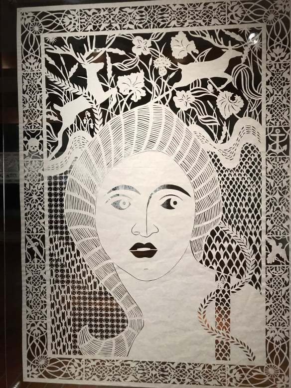 Karen’s art pieces are called psalm graph, the creation of pictures on paper by cutting patterns and motifs. The psalm graphical work is formed by a large continuous piece of paper and is cut exclusively with scissors.