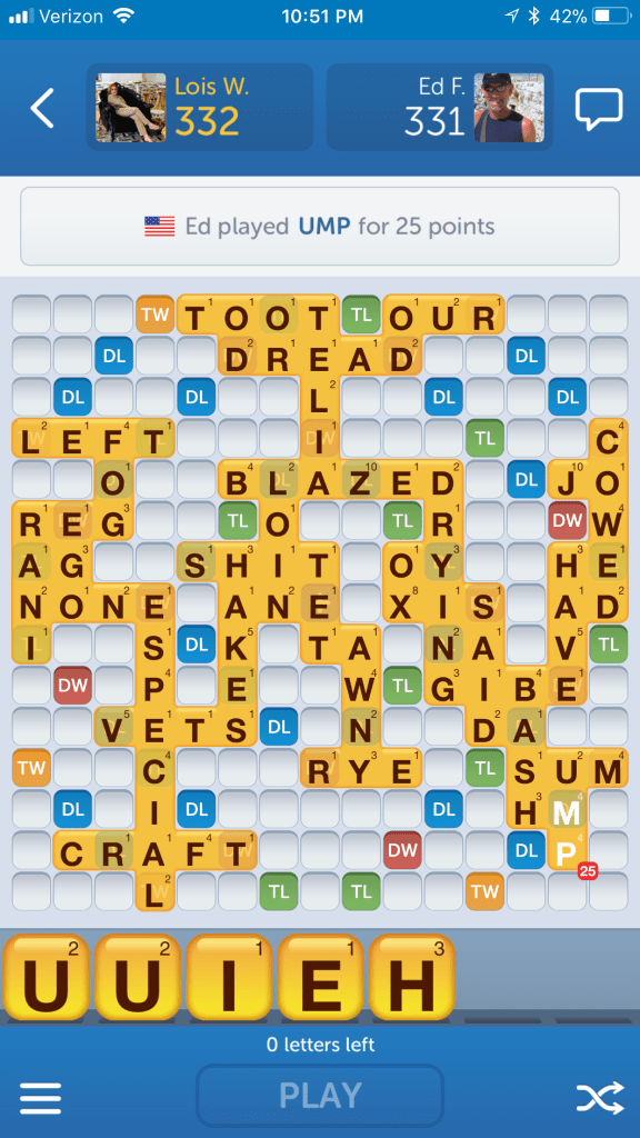 It does get a little embarrassing when they are slaughtering me, but I also get uneasy when I am beating them. I often wonder what they are thinking when I create a word over 30 points, I know what I think when a few of my competitors manage to score 60 plus points. I never think they are cheating. I become envious of their word skills. I wonder how they got so smart.