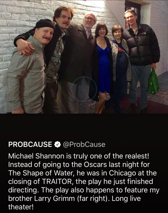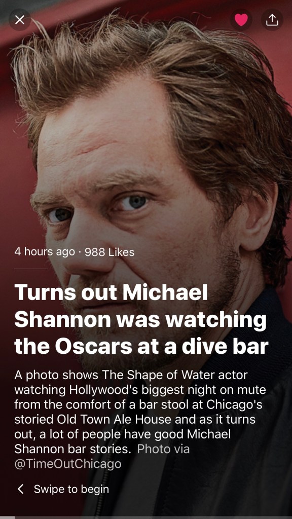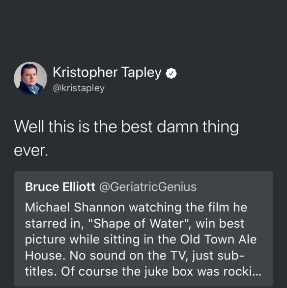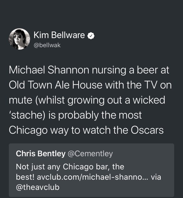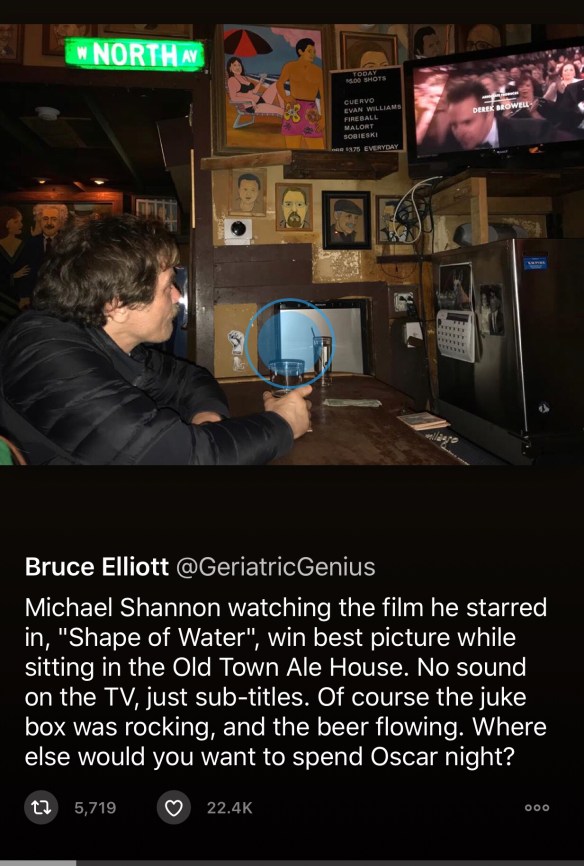 A group of Twitter folks spotted Michael Shannon at a bar in Chicago during the awards show and posted the sighting immediately. Michael Shannon starred in The Shape of Water.