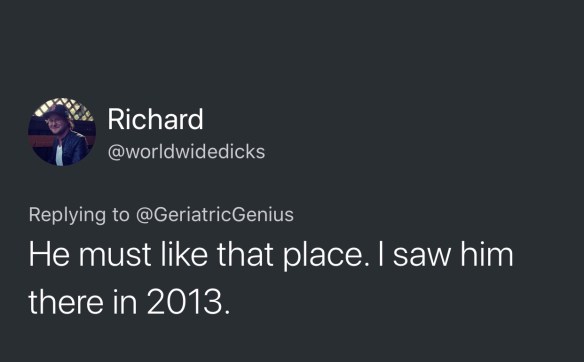 hilarious but a nice break from the usual twitter leader… and good for him choosing his priorities – am sure if he didn’t want to be seen in public, he could have done that too
