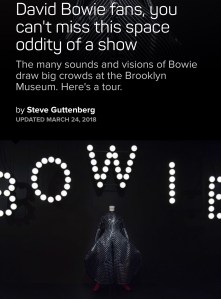 A well-known audio enthusiast/tech writer friend of mine, Steve Guttenberg, (not the actor), told me not to miss the “David Bowie Is” exhibit currently at the Brooklyn Museum, March 2 to July 15th. I plan to see it in May when I’m in New York for an extensive period of time.