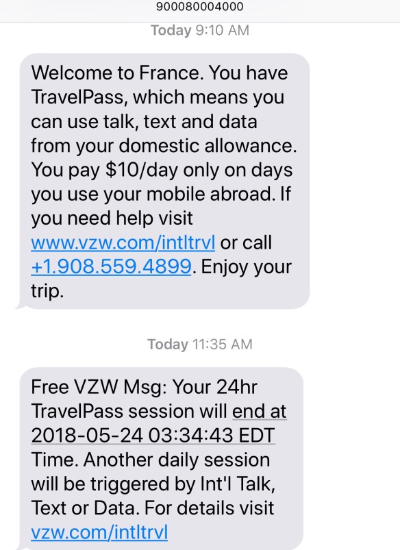 Verizon has TravelPass. The minute I arrived in Paris, I received the welcome text below. It’s a whole new world.