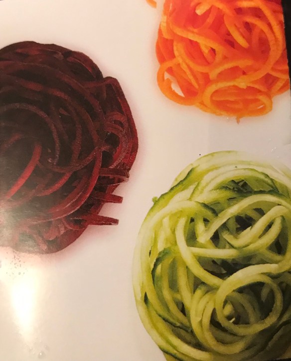 You can use a spiralizer to cut vegetables, or fruits, so they look like noodles. It’s a wonderful substitute for pasta. I was told the best spiralizer is the Joseph Joseph Spiro, a 3-in-1 hand-held unit. It comes with three different blades to produce different shapes and sizes.
