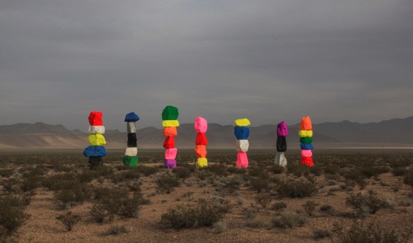 Internationally renowned Swiss artist Ugo Rondinone’s Seven Magic Mountains is a large-scale site-specific public art installation located near Jean Dry Lake and Interstate 15, approximately ten miles south of Las Vegas, Nevada. Comprised of seven towers of colorful, stacked boulders it stands more than 30 feet high,