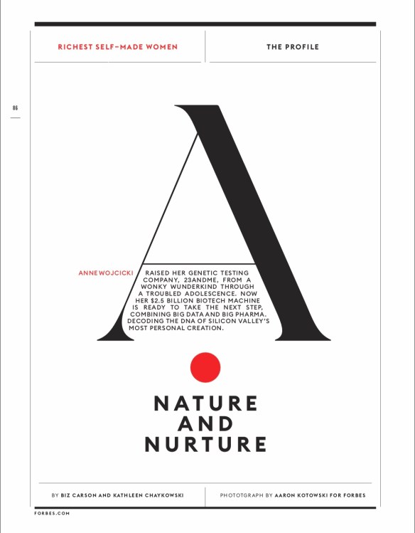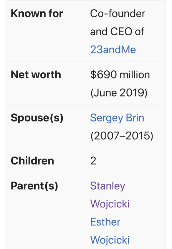 Yesterday, I told you about Anne Wojcicki and her company, 23andMe. Forbes did a recent story on Anne which I included below. She was married to Google co-founder Sergey Brin from 2007 until separating in 2013. They divorced in 2015. They had two children together and now as a single woman she is pregnant with her third.
