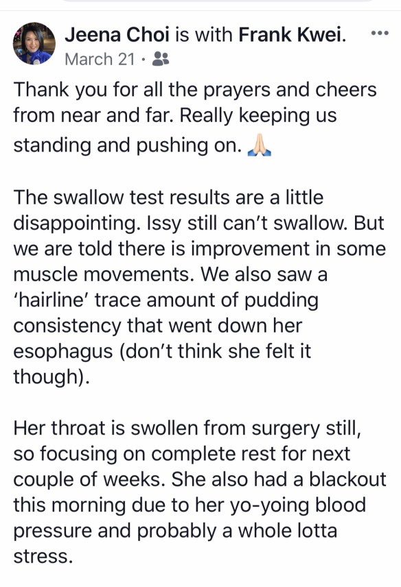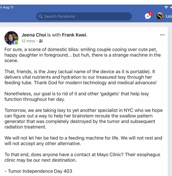 I’m writing this blog post with every hope that somone can help find a cure for the eldest daughter, Issy, of my friend Jeena and her husband Frank Kwei. Issy can’t swallow and has to be fed through a feeding tube. It’s all explained below.