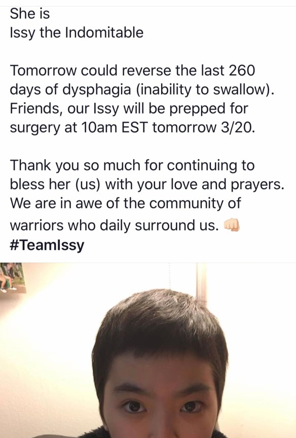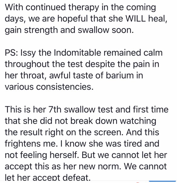 Last update left us all full of hope that the myotomy surgery will help Issy swallow. Well, it didn’t. The swallow team is dumbfounded and no one at MGH nor Yale can give us an accurate prognosis when it comes to her dysphagia.