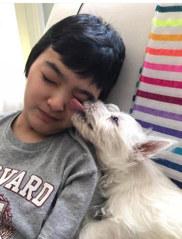 Back in Dec., Issy left on a wheelchair, but returned home in April without one! Her recent MRIs are clean and her hair… wow- grew back in full force in thick, WAVY (she had stick-straight hair prior to chemo) strands! She also got back in the saddle thanks to New Canaan Mounted Troop’s adaptive riding program, turned into a teen on May 4th, watched Hamilton in NYC (thank you, LivFree organization!) and one of her wishes came true: a Westy puppy to call her own!