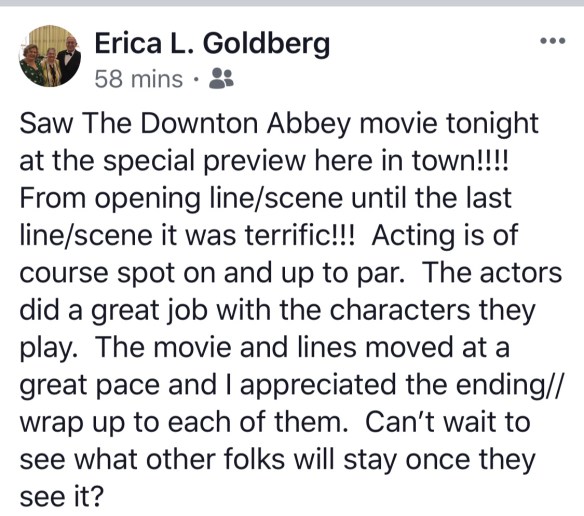 Eliot and I saw Downton Abbey, the movie, tonight. We really enjoyed it. It was very well done. We saw it in Miami and my friend, Erica Goldberg, watched it in Northern Florida. Her description below really nails it.