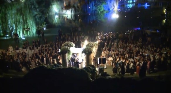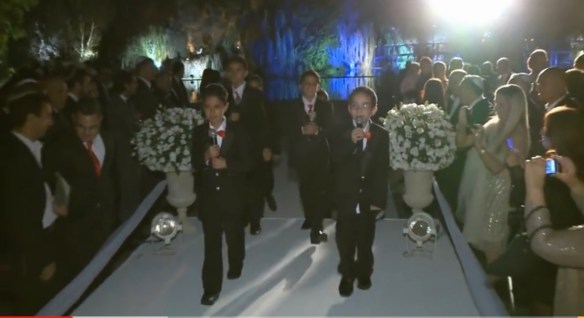A friend in Rome points out that this video, made 5 years ago, was produced at Ronit Farm in Israel as a promo for the singer (who was NOT a cantor). The family may or may not have been Italian; she says that lots of Italians fantasize for such over-the-top events. More such extravagant weddings appear here: https://www.smashingtheglass.com/totally-spectacular-destination-wedding-with-17-bridesmaids-at-ronit-farm-kfar-shmaryahu-herzliya-israel/