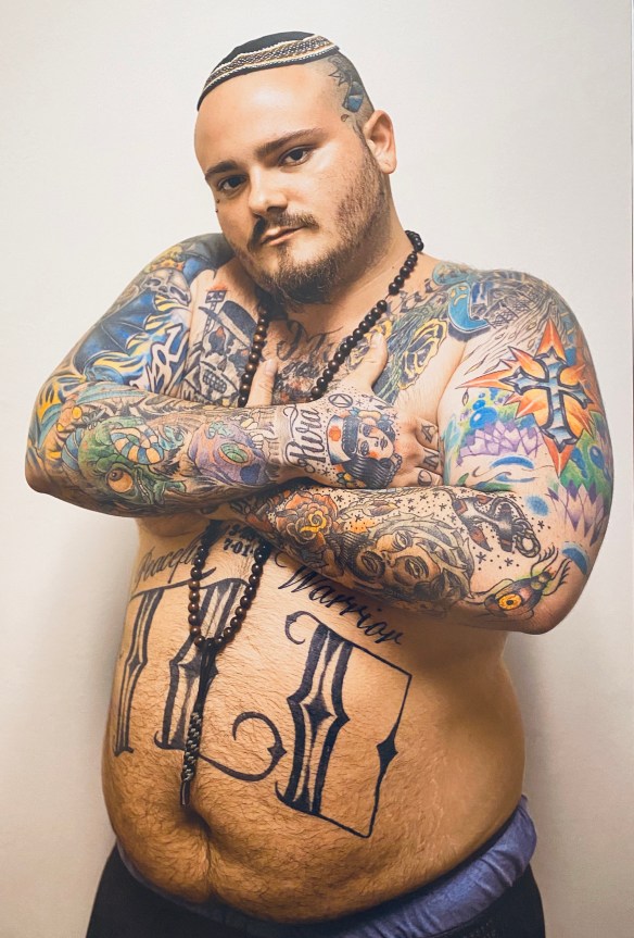 ”Balber engaged the subjects of the photo series in addressing their own Jewish identities by including his personal Bar Mitzvah Kippah in all of the photos. Some of the photos in the series depict members of Balber’s family who influenced his search for his Jewish identity. Of note, Balber himself has no tattoos.