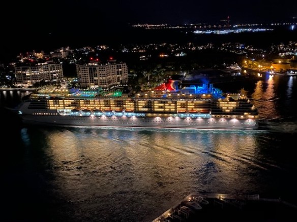 We Will Be Back !!!! A sign of great hope. A Carnival Cruise Ship passing by our condo windows a few minutes ago. I think they created these words with their guest room lights. Eliot Hess quickly captured it. All the ships are parked next to the Port of Miami. They rotate going out to the ocean to make room for others —then they sail back in.
