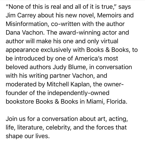 Funny man Jim Carrey gets pretty serious about life, yet still makes you laugh. Eliot and I watched the interview with Jim and his co-author Dana Vachon. Books & Books of Miami hosted the event last night and my video is probably the first to be published. I hope I don’t get in trouble.