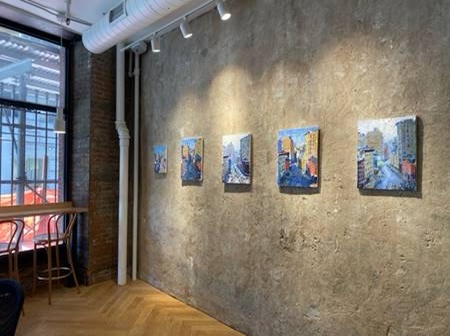He decided to use the café gallery to show his work and he has set up an exhibit of his paintings of the neighborhood which include shutdown paintings. “I watched the whole story unfold from my window upstairs, the emptiness of the city, the demonstrations… Then I watched hundreds of people roam the streets and loot all the stores around- including mine. I called 911 many times and nobody answered. Here I was in Soho, which was once one of the most secure spots on Earth and I was seeing total anarchy. I felt the whole system failed. Still, I was glued to my window and wanted to capture this unique chapter in NYC’s history in art.”