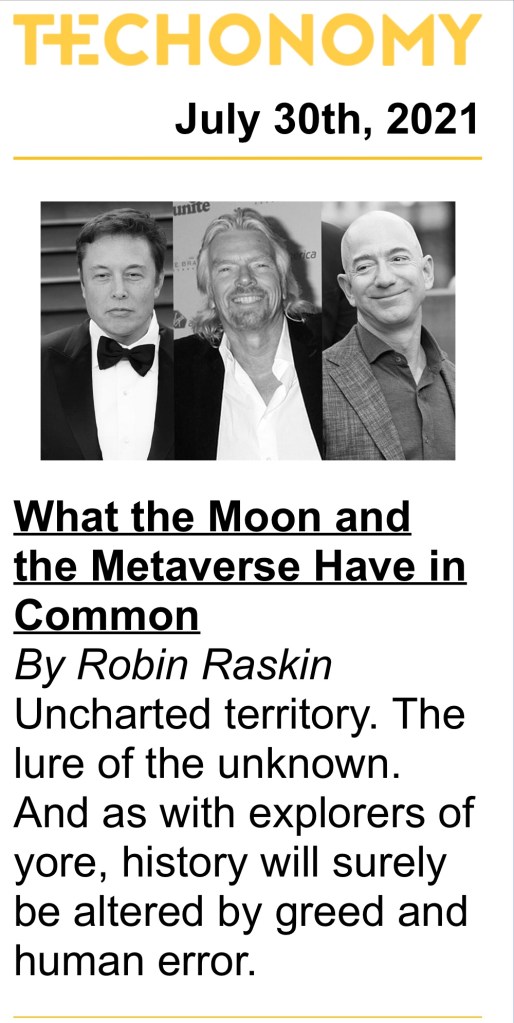 My Friend Robin Raskin outlines what Richard Branson, Jeff Bezos, and Elon Musk are doing in the worlds of outer space and digital space. Pay close attention. You will probably be visiting both.