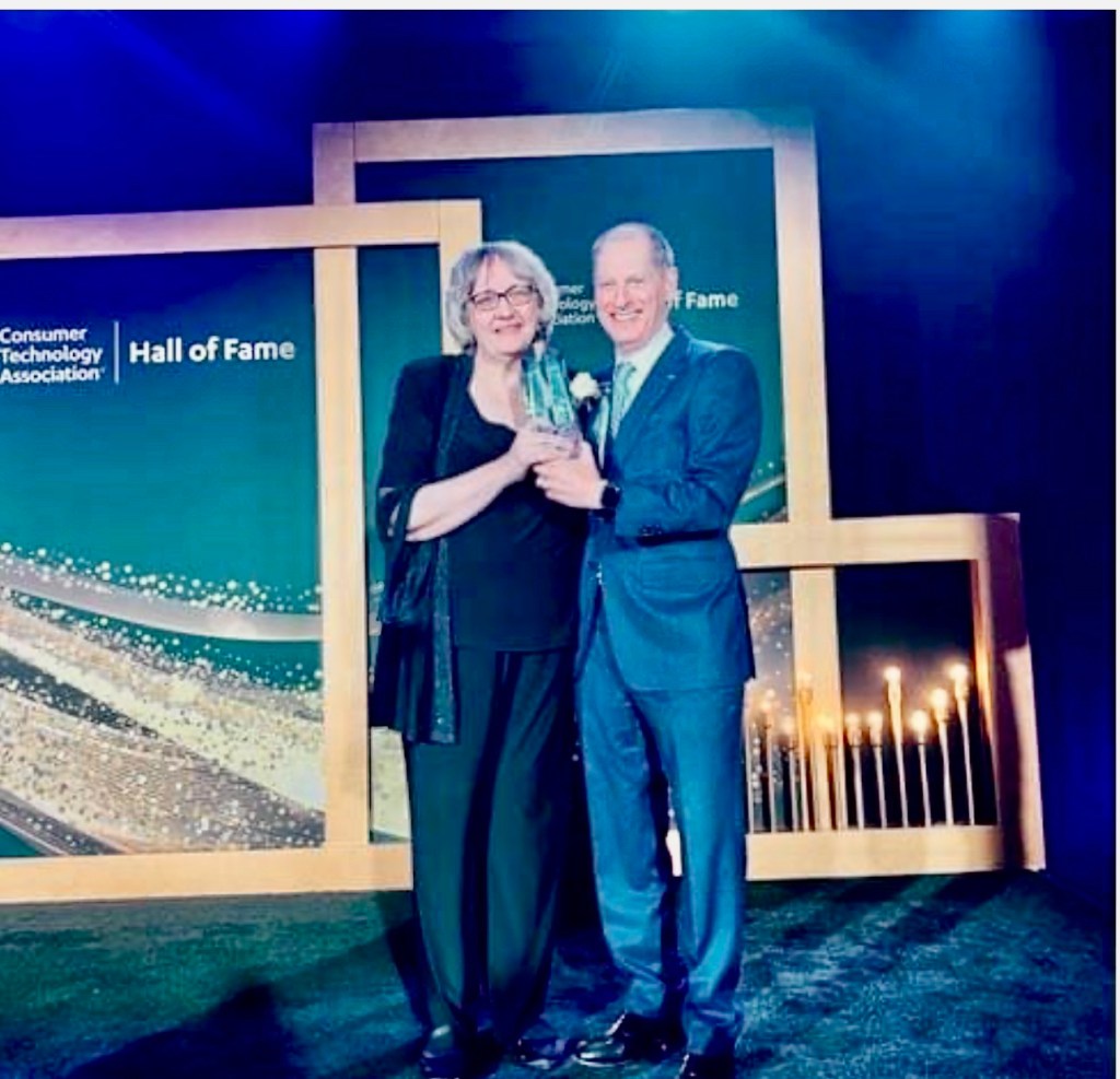 Nancy Klosek receiving her award from Gary Shapiro, President of the Consumer Technology Association.Robin Raskin, the lady in red, poses with her admirers.