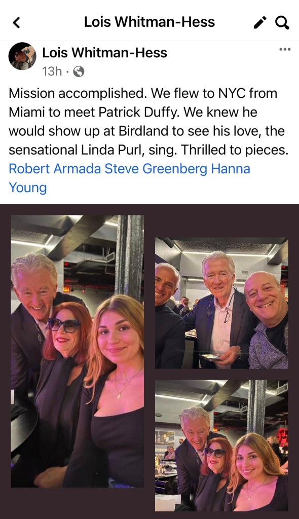 I heard this story a few months ago from my friend Ron Abel but actress/singer Linda Purl told it last night to the audience at Birdland. She and actor Patrick Duffy found love again over Zoom during the pandemic. You can read all about it below.