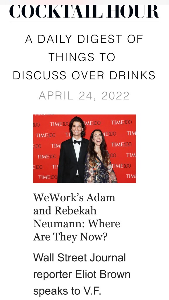 “You get the sense from people around him that he has not changed,” Brown adds. “Early on, I think some of his friends sensed a large amount of remorse and that he had gotten really subdued. But if you talk to those people now, I think they would say that was a fleeting moment.” Referring to Adam’s first public interview since leaving WeWork, last November, Brown said, “If you look at the New York Timesinterview, he didn’t apologize. And I know that stung a lot of former WeWork staffers a lot.”