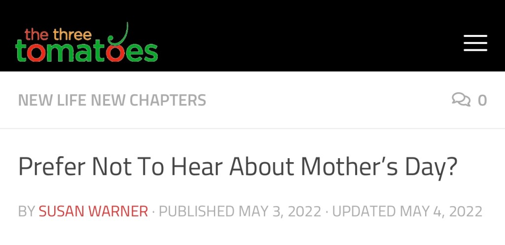 Me too. I received an email last week from a renowned perfume company with that headline. The body of the email went on to say, “We understand that this can be a difficult time for some people. If you would like to opt out of Mother’s Day emails, please let us know.” Alright, I am letting you know. And also, opt me out of Father’s Day and Valentine’s Day and a variety of other holidays that are antiquated and emotionally inefficient in today’s culture.