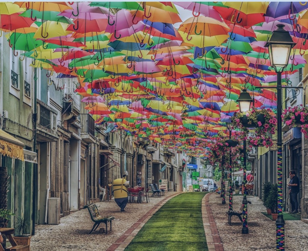 Águeda’s Umbrella Sky Project began in 2011 as a part of the Portuguese city’s annual Ágitagueda Art Festival. Each summer, when temperatures soar, a handful of Águeda’s narrow streets feature canopies of colorful umbrellas that provide shade to the pedestrians below.