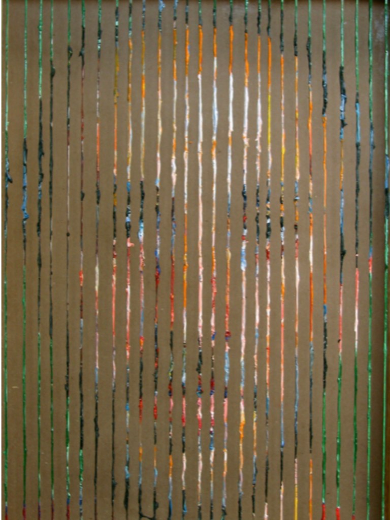 Hirsch’s art is founded on the principal that perceiving and feeling the subject automatically projects thru the hand onto the canvas. “I don’t have to look at the picture,” Hirsch says. “I just have to focus on internalizing the subject.” The string paintings emphasize this phenomenon; the felt image translates into little dabs of paint on strings which convert back into the perceived image in the viewer’s brain. “This is also a human parallel to the way computers digitalize images.”