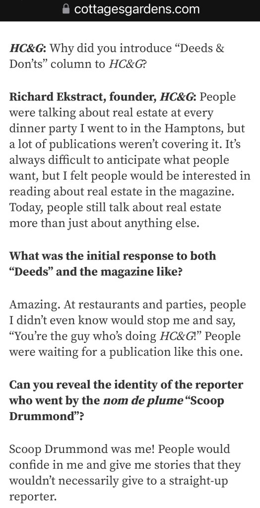 Hamptons Cottages & Gardens Celebrates Its Founder, Richard Ekstract As It Turns 20 Years Old. Richard, a well respected art collector, is also the greatest publisher of consumer electronics, licensing, and real estate publications. He is 91 and lives in Palm Beach and NYC with his devoted wife Eileen. Richard and I are working on his memoirs together.