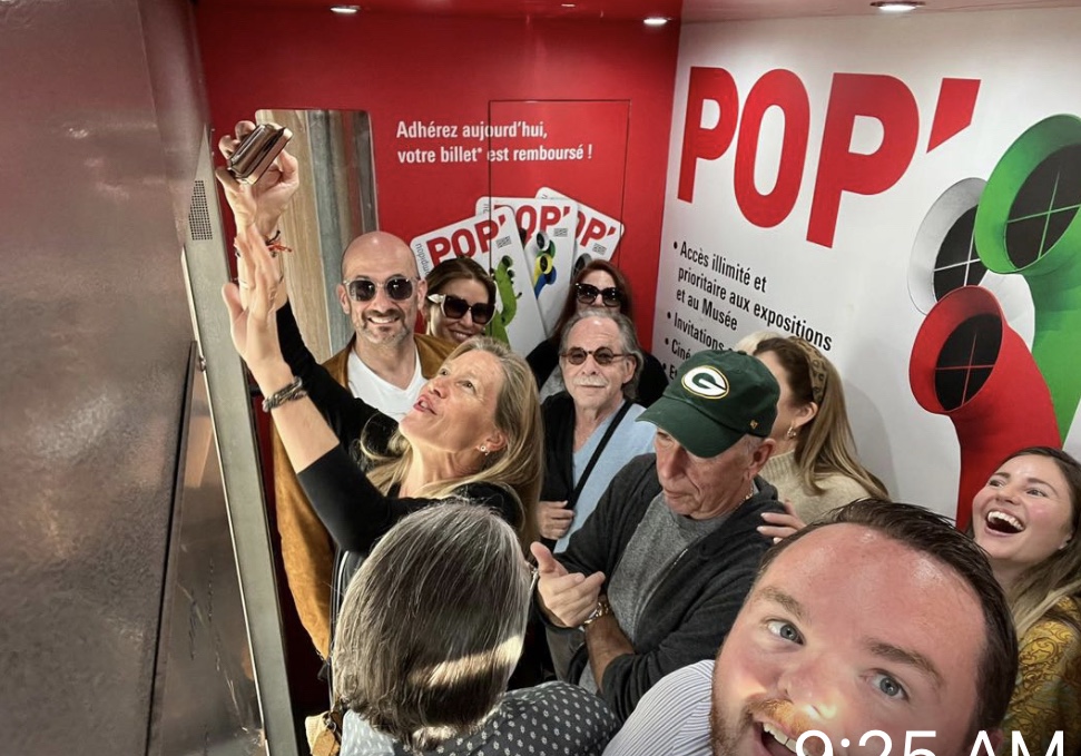 This photo will go down in history. Amani Lewis, (hugging Eliot) one of the most popular artists in recent years, and a Fountainhead Arts alumni, joined us with her assistants, for lunch. Her Art Basel Paris pieces and her solo show at LGDR Paris sold out before the exhibits opened. Several folks in the crowd are her collectors. What an exhilarating experience to be a part of.