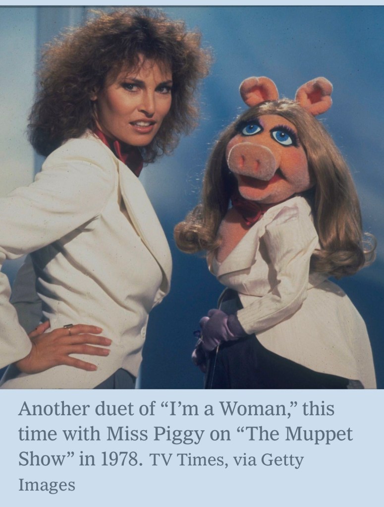 She moved beyond film sets, developing a nightclub act that played to sold-out crowds in Las Vegas and became the basis for a CBS special, “Really, Raquel.” Through the 1970s, she was a regular on variety shows, singing the same song, “I’m a Woman,” with both Cher on “The Cher Show” and Miss Piggy on “The Muppet Show.”