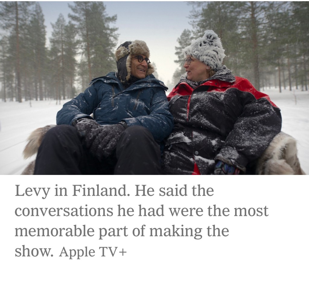 They’d never get Levy to a safari, he told them. He had watched animals on wildlife programs and didn’t need to travel halfway around the world to see them again. He doesn’t love water. He doesn’t like the hot; he doesn’t like the cold. This, along with Levy’s vehement aversion to sushi and fear of humidity that could ruin his hair, became basically the episode guide for “The Reluctant Traveler,” which premiered Friday on Apple TV+ and follows Levy from Finland to the Maldives. There is a safari episode, a hot episode, a cold episode, a jungle episode and a lot of uncooked fish.