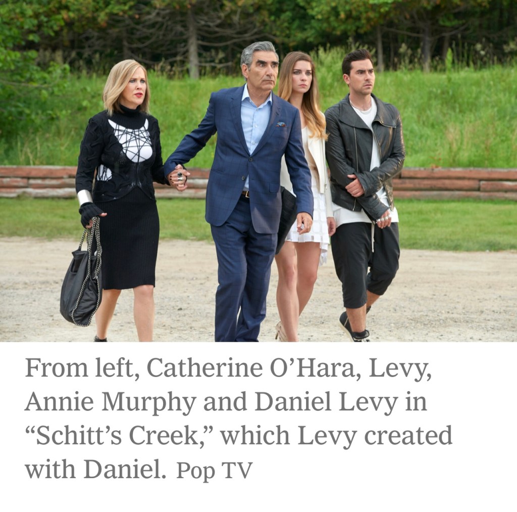 It was in “Schitt’s Creek,” the great sitcom Levy created with his son, Dan, about a group of coddled people who gain sentience through exposure to real life, that he came closest to portraying himself: an affable, affluent father who wears nice suits and has no tolerance for bad hotels. He was working with both of his children — Sarah played a diner waitress named Twyla — and the closeness of the role to himself created a dual consciousness in his performance that he hadn’t previously experienced. “I can’t believe my kids are on camera here with Catherine O’Hara,” Levy would think while he was acting in a scene with Catherine O’Hara.